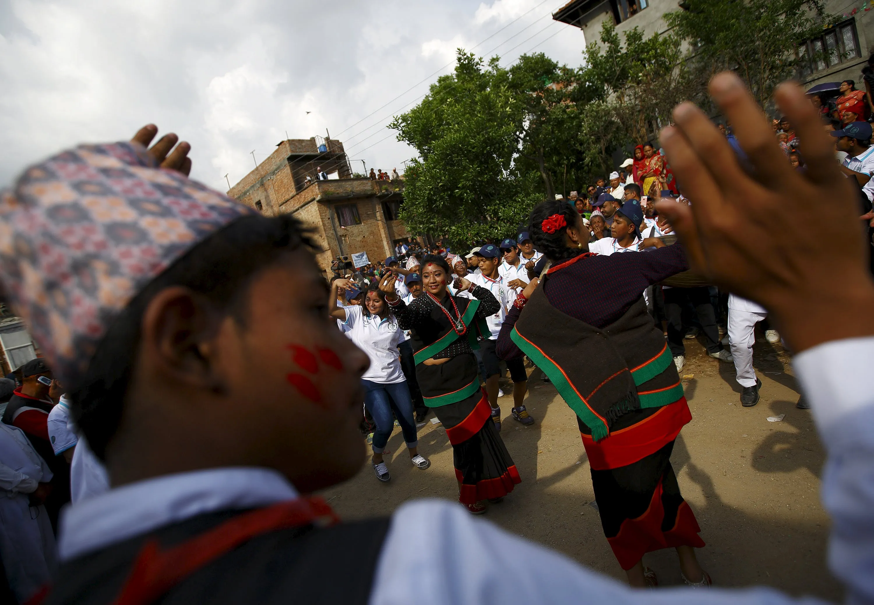 Devotees in traditional attire dance to the beat of traditional musical instruments near the chariot of Rato Machhindranath during the chariot festival at Bungamati in Lalitpur April 22, 2015. (Photo by Navesh Chitrakar/Reuters)