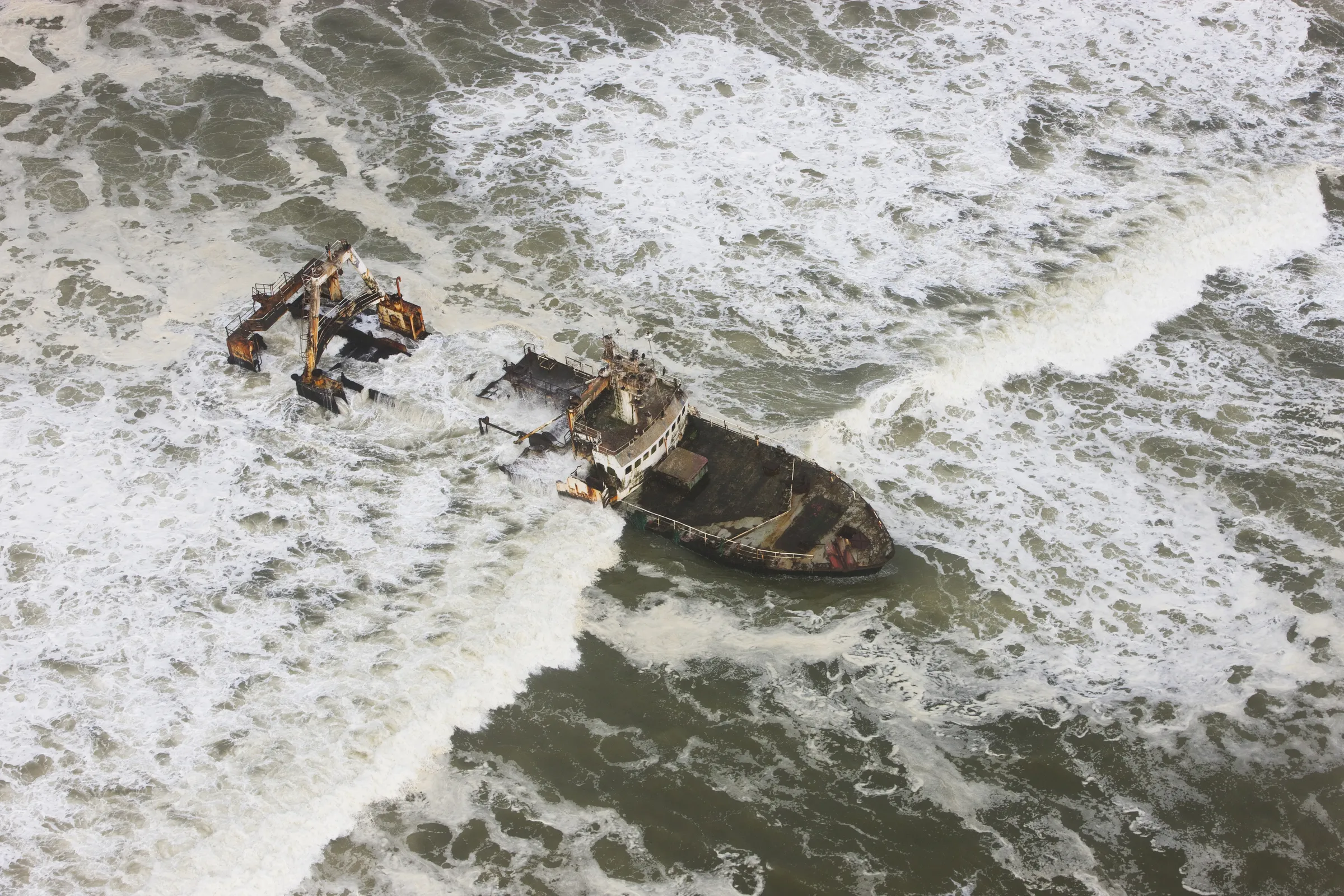 An aerial view aerial view of shipwreck Zeila which stranded in 2008, in October, 2014, in the Namib Desert, Namibia. (Photo by Theo Allofs/Barcroft Media)