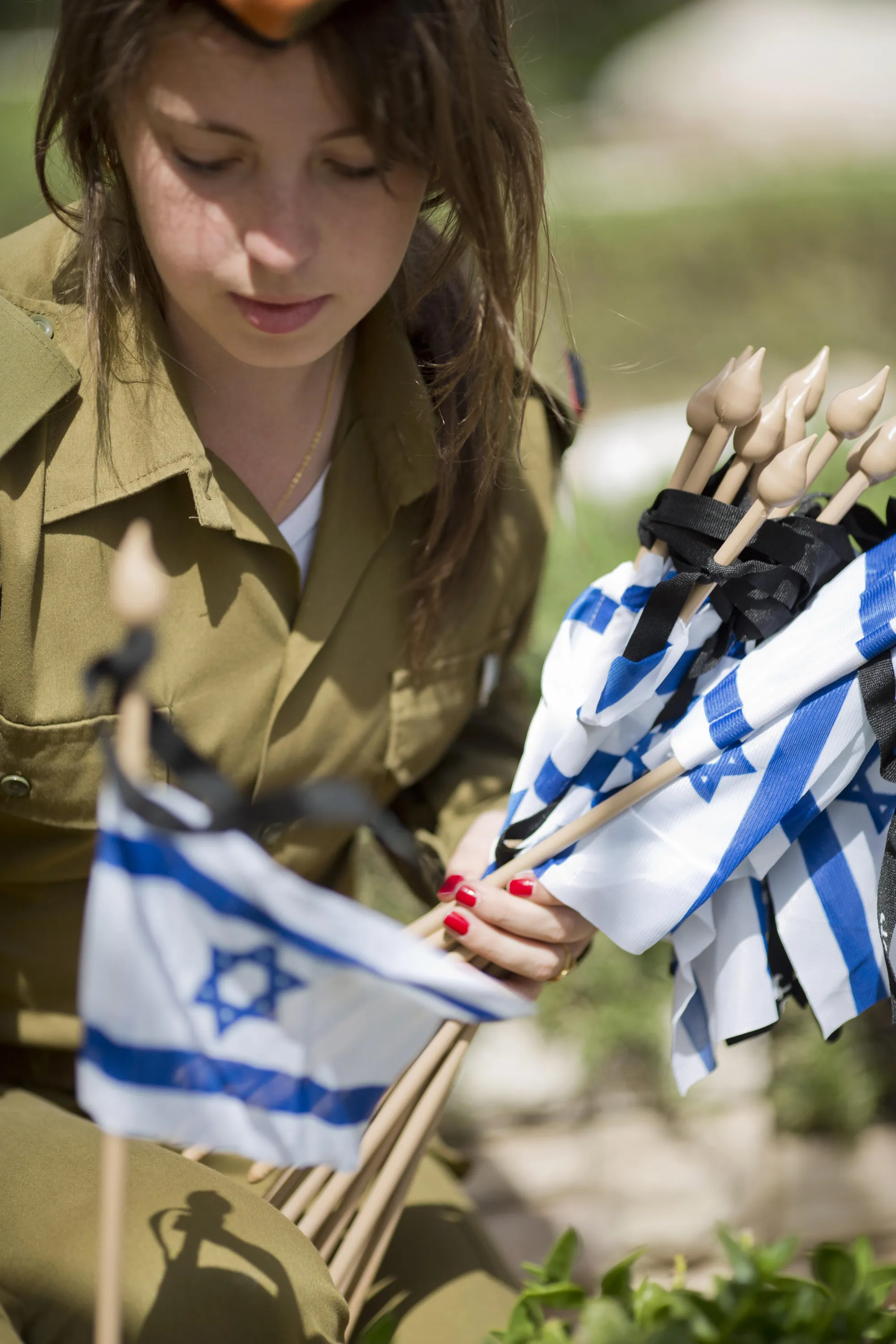 An Israeli soldier places a small national flag with a black ribbon on the grave of a fallen soldier on the eve of Memorial Day at the Kiryat Shaul military cemetery in Tel Aviv, Israel, Tuesday, April 21, 2015. Israel marks the annual Memorial Day in remembrance of soldiers who died in the nation's conflicts, beginning at dusk Tuesday until Wednesday evening. (Photo by Ariel Schalit/AP Photo)