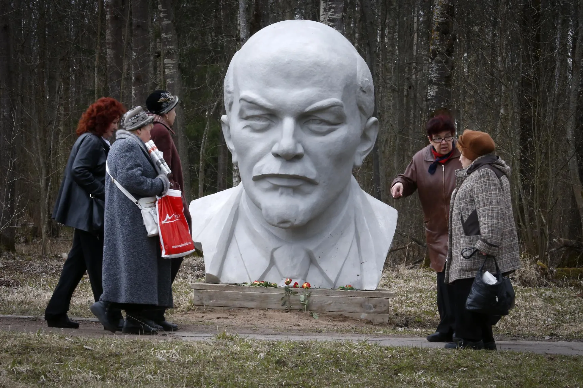 People walk past a statue of Soviet Union founder Vladimir Lenin during celebration of his 145th birthday at the Lenin Hut Museum at Razliv lake, outside St.Petersburg, Russia, Wednesday, April 22, 2015. (Photo by Dmitry Lovetsky/AP Photo)