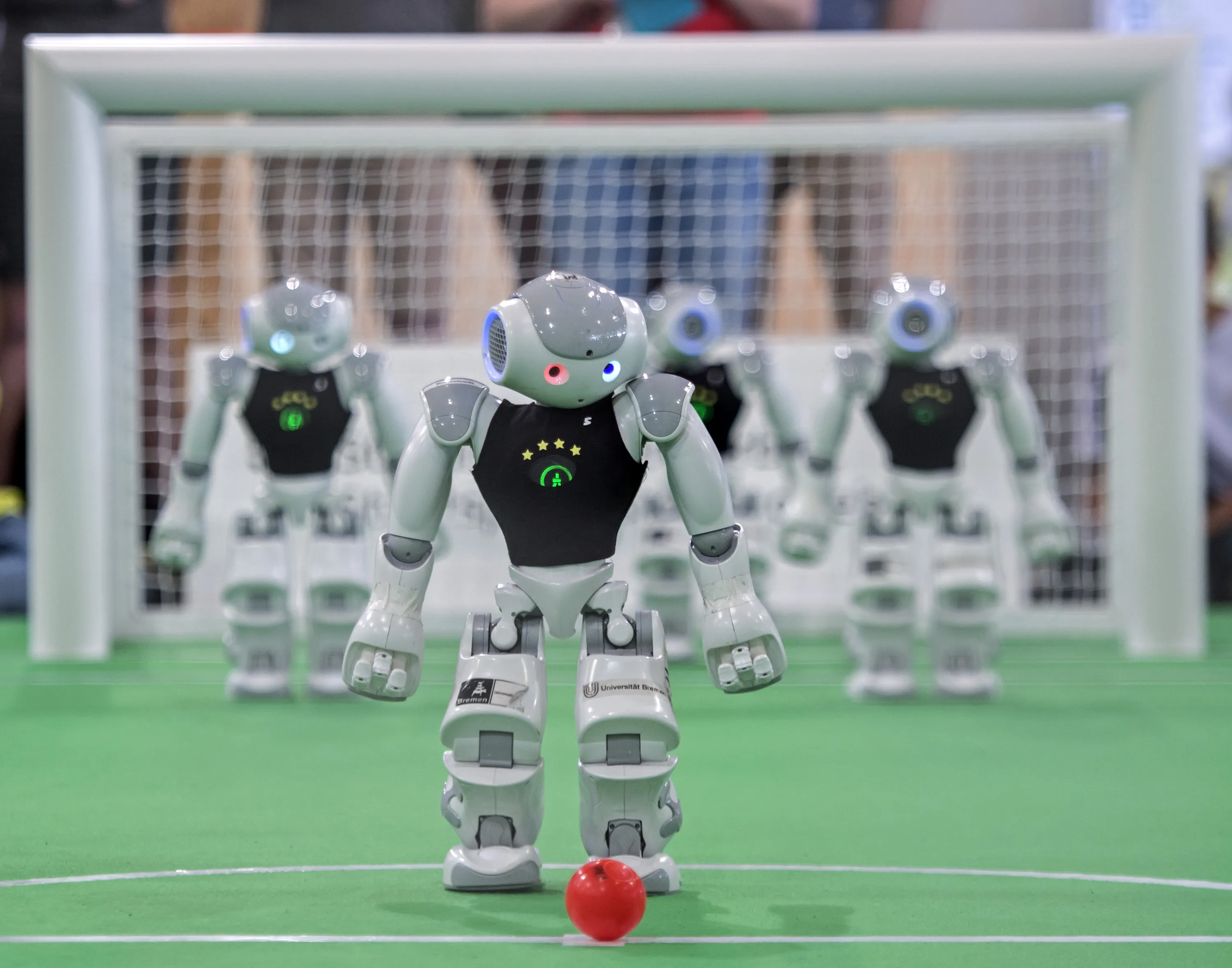 A robot playsa the ball during a soccer match at the RoboCup German Open 2015 in Magdeburg, Germany, Friday, April 24, 2015. Around 200 teams from 14 countries demonstrate the state-of-the-art in robotics with competitions such as soccer, rescue and service robots. (Photo by Jens Meyer/AP Photo)