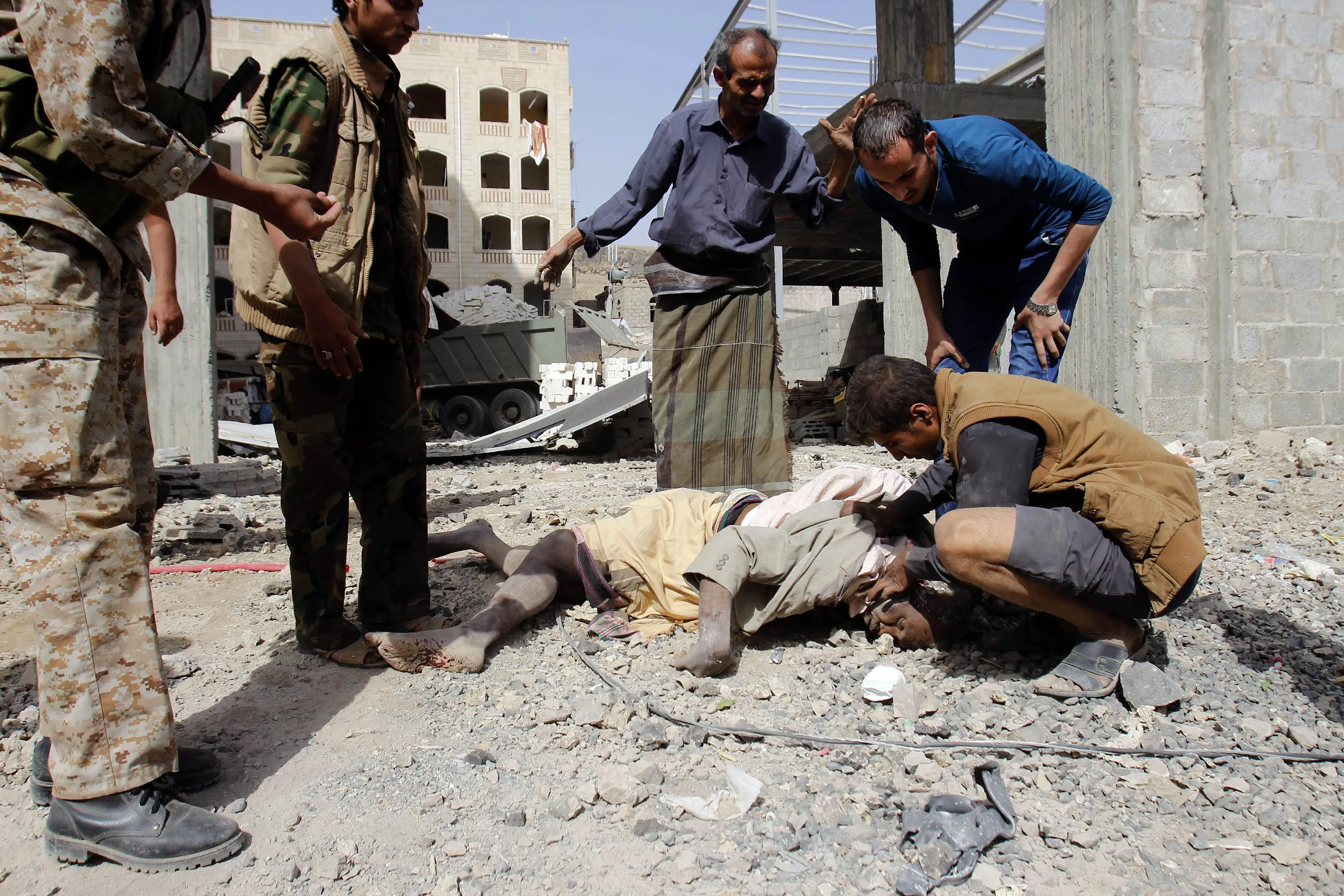Yemenis checks the body of a man killed in a Saudi-led airstrike against Iran-allied Shiite rebels, known as Houthis, that hit a site of a weapons cache in Yemen's capital, Sanaa, Monday, April 20, 2015. The strikes on Yemen's rebel-held capital on Monday caused massive explosions that shattered windows, sent residents scrambling for shelter and killed a local TV presenter. (Photo by Hani Mohammed/AP Photo)