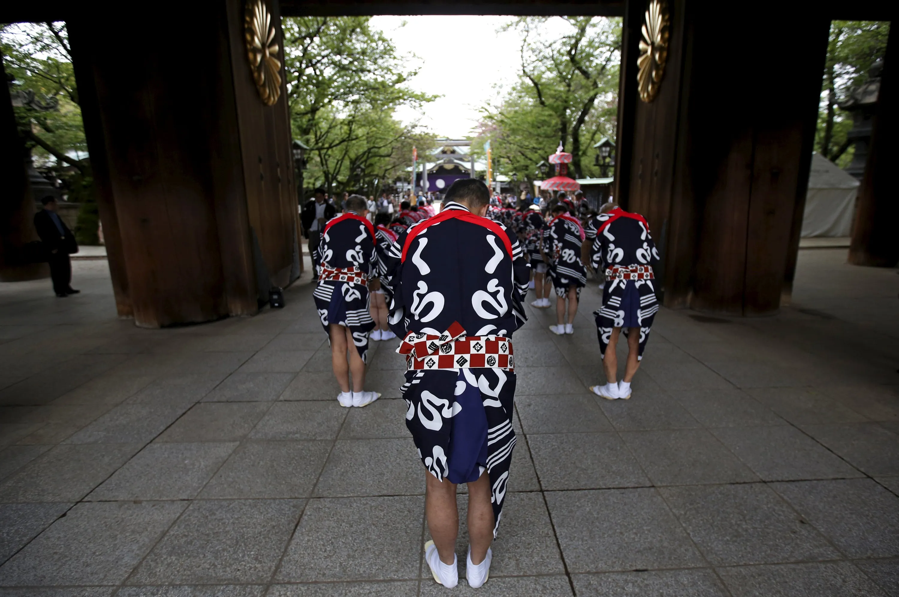 Traditional dance performance group members wearing traditional costumes bow towards the main shrine as they visit Yasukuni Shrine in Tokyo April 21, 2015. Japanese Prime Minister Shinzo Abe sent a ritual offering on Tuesday to a Tokyo shrine for war dead, a senior spokesman said, a day before he hopes to meet Chinese President Xi Jinping on the sidelines of a leaders' summit in Jakarta. (Photo by Issei Kato/Reuters)