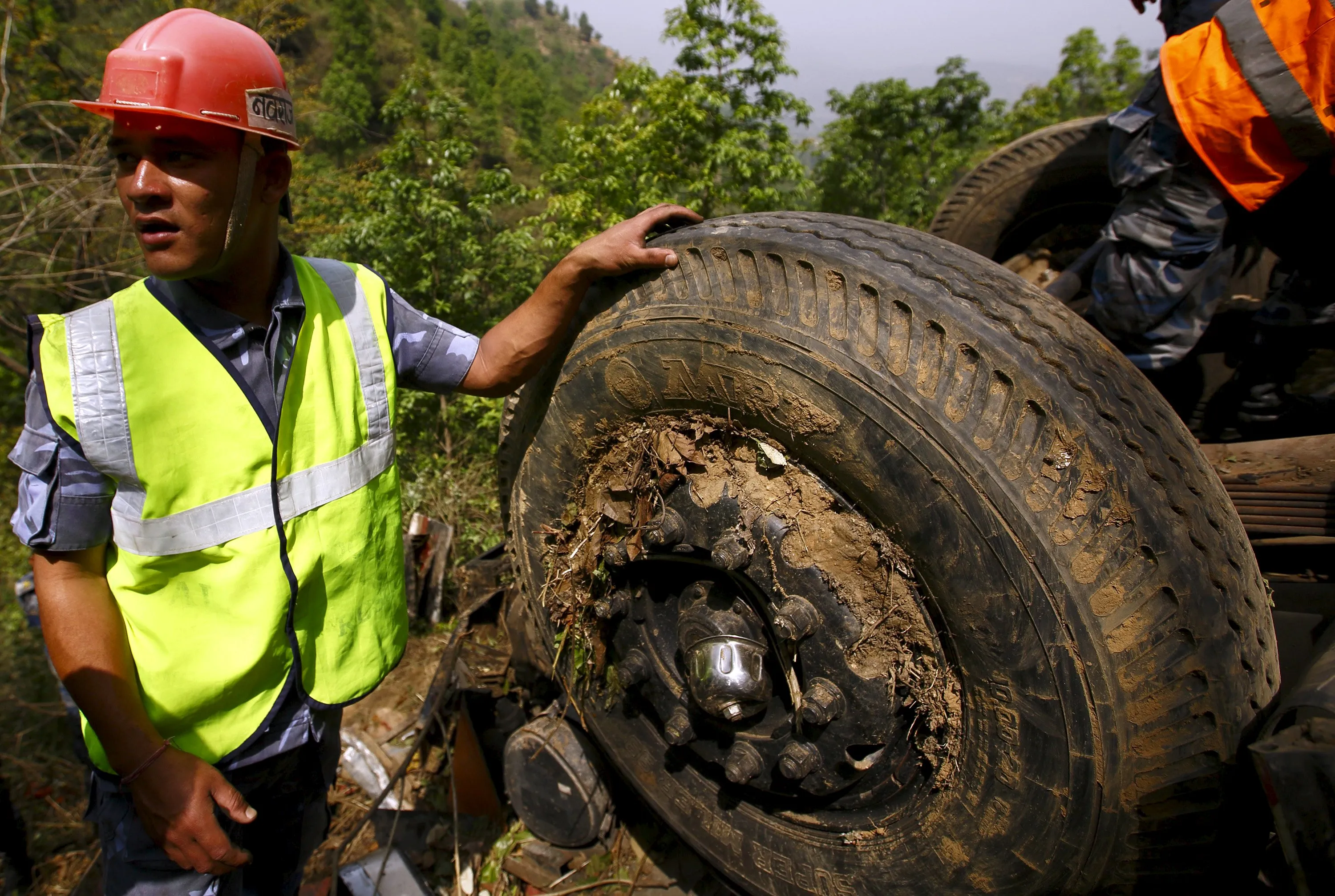 A rescue team member stands next to the wreckage of a bus while recovering the bodies of the victims at Jayaprekhola in Dhading district, on the outskirts of Kathmandu, Nepal April 22, 2015. A bus with an Indian number plate carrying Indian pilgrims fell around 200 meters down the hill from the Prithivi Highway and 16 Indian pilgrims were killed, according to local media. (Photo by Navesh Chitrakar/Reuters)