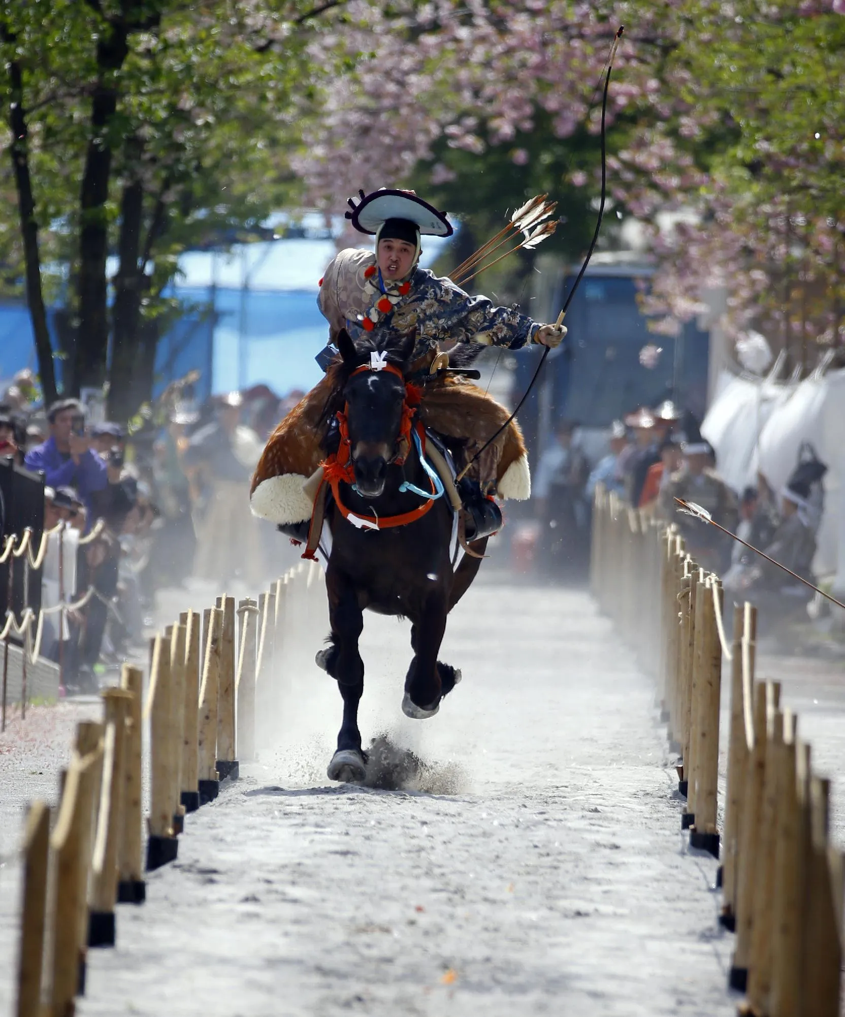 An archer in a samurai warrior costume aims at a target in the Asakusa Yabusame horseback archery event at Sumida Park in Tokyo, Saturday, April 18, 2015. (Photo by Shizuo Kambayashi/AP Photo)