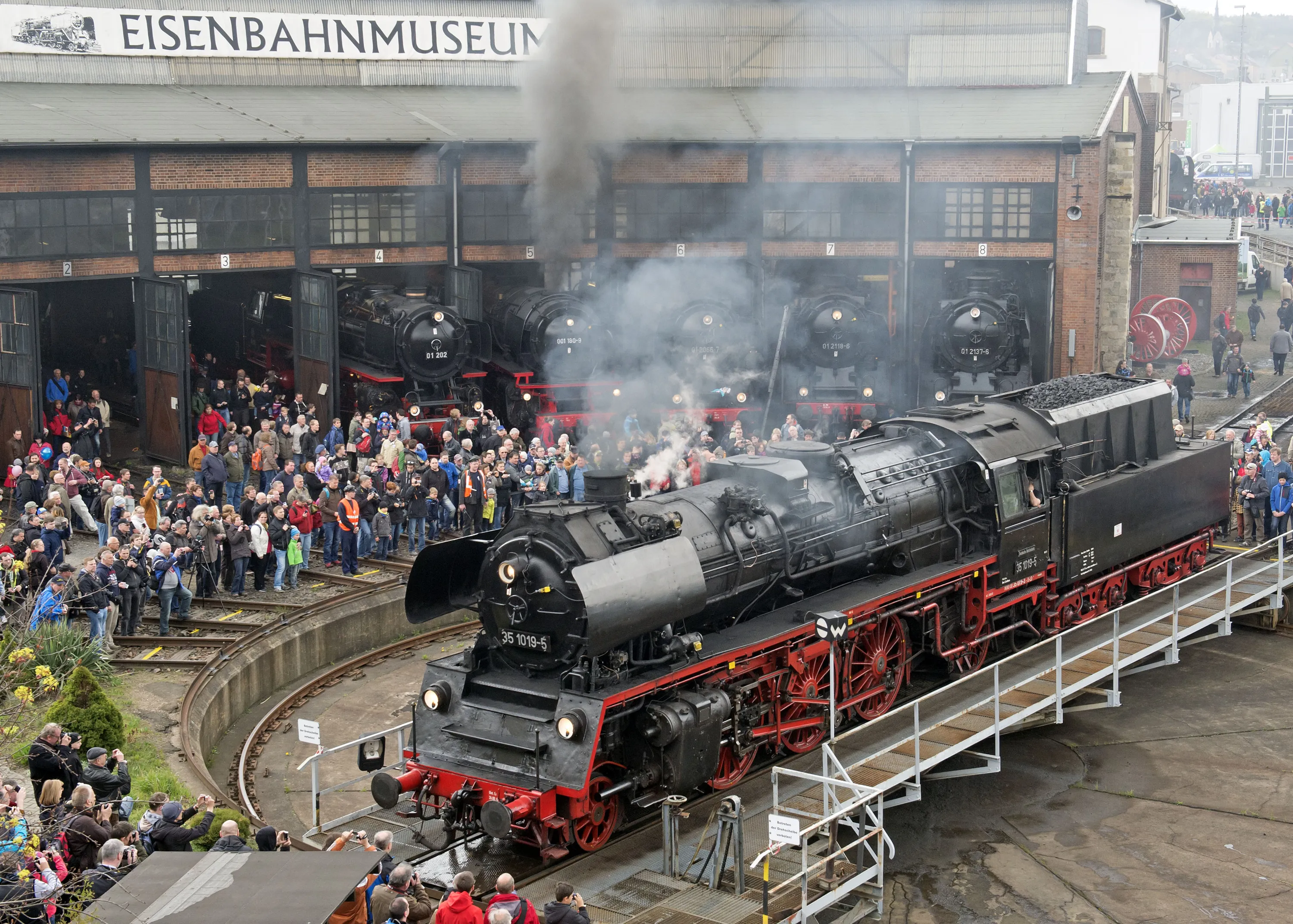 Visitors admire a steam locomotive during the Dresden Steam Locomotive Festival, the biggest steam engine spectacle in Germany, in the maintenance depot of the railway museum in Dresden, eastern Germany, Saturday, April 18, 2015. (Photo by Jens Meyer/AP Photo)