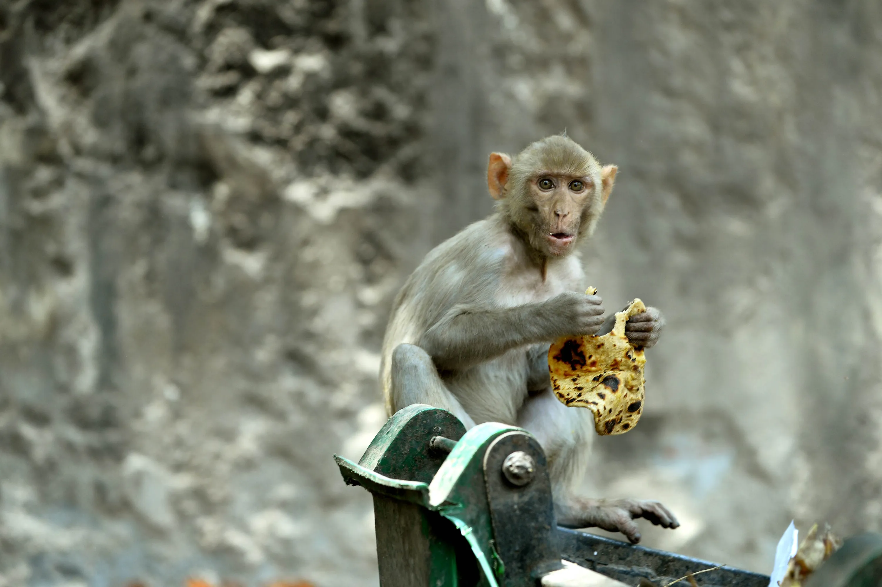 A monkey looks on as it eats a chapati (flat bread) from a garbage bin in New Delhi on April 24, 2015. (Photo by Chandan Khanna/AFP Photo)