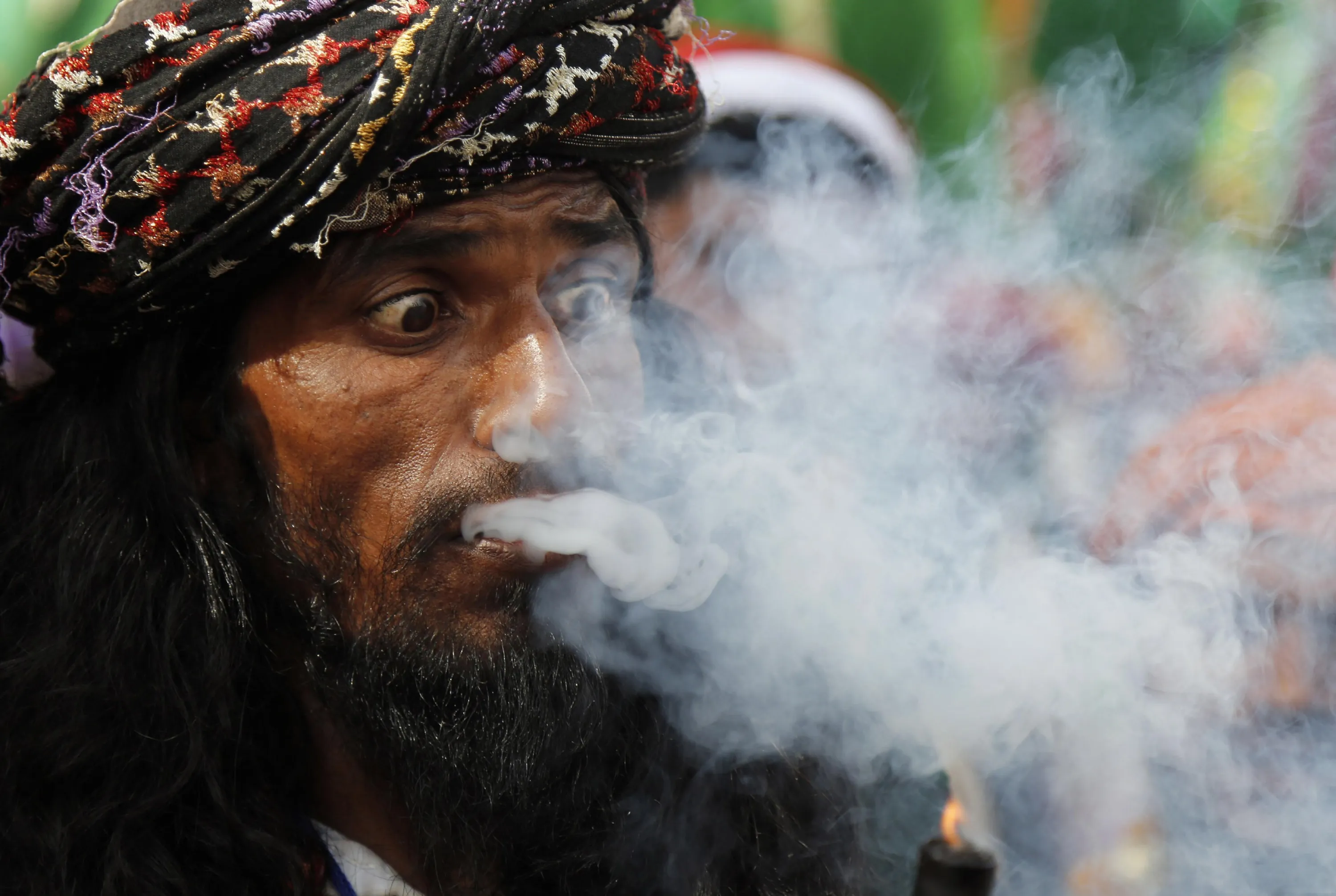 An Indian Muslim Sufi devotee smokes marijuana in a procession during the Urs festival at the shrine of Sufi saint Khwaja Moinuddin Chishti in Ajmer, India, Sunday, April 19, 2015. Thousands of Sufi devotees from different parts of India travel to the shrine for the annual festival, marking the death anniversary of the saint. (Photo by Deepak Sharma/AP Photo)