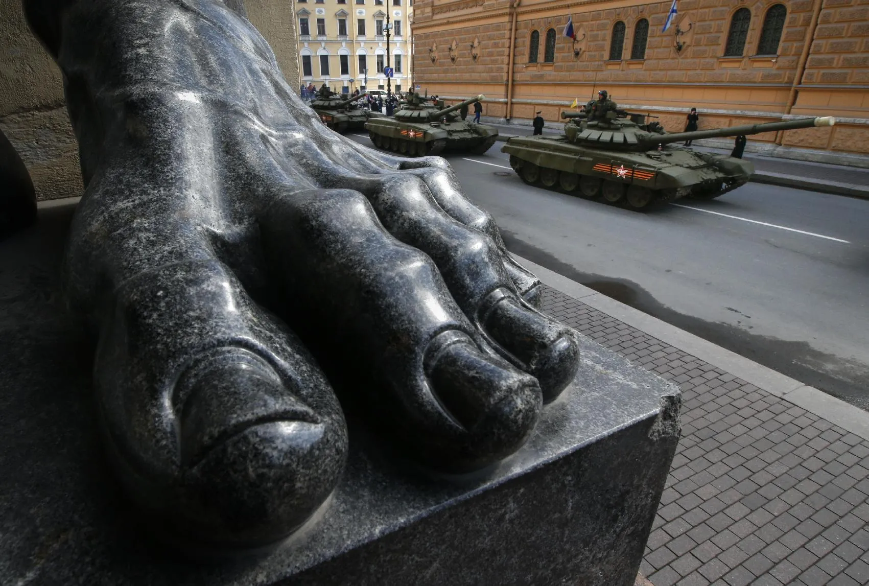 Russian T-72 tanks drive past a sculpture of Atlas at the State Hermitage museum during a rehearsal for the Victory Day military parade which will take place at Dvortsovaya (Palace) Square on May 9 to celebrate 70 years after the victory in WWII, in St. Petersburg, Russia, Thursday, April 30, 2015. (Photo by Dmitry Lovetsky/AP Photo)