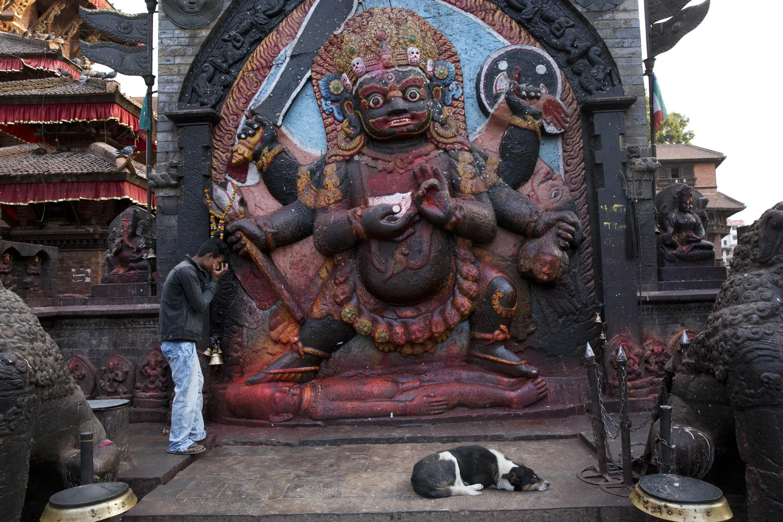 A man offers prayers to Hindu God Bhairav at Basantapur Durbar Square, a lot of which was damaged in Saturday's earthquake, in Kathmandu, Nepal, Sunday, April 26, 2015. The earthquake centered outside Kathmandu, the capital, was the worst to hit the South Asian nation in over 80 years. It destroyed swaths of the oldest neighborhoods of Kathmandu, and was strong enough to be felt all across parts of India, Bangladesh, China's region of Tibet and Pakistan. (Photo by Bernat Armangue/AP Photo)