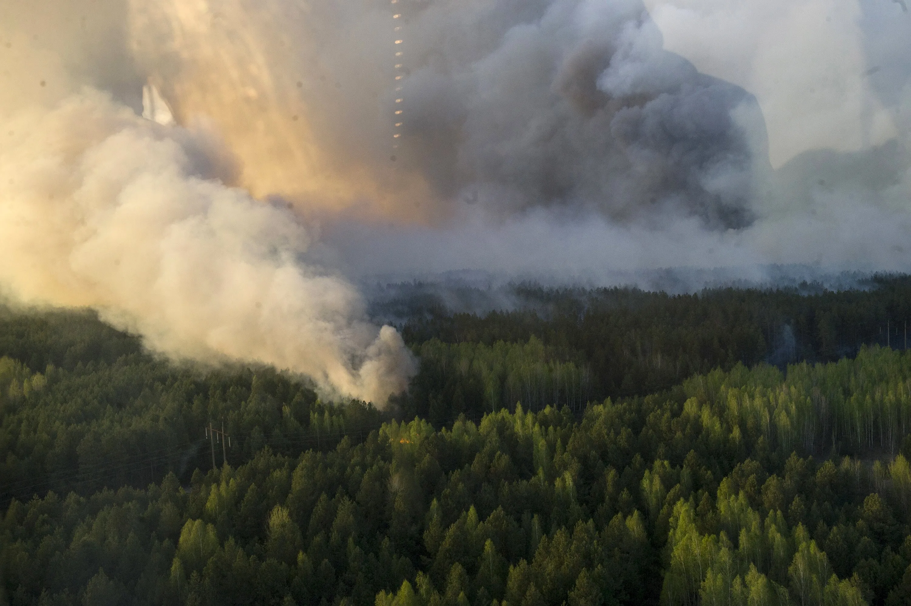 An aerial view through a window of a helicopter shows smoke from forest fires in northern Ukraine, April 28, 2015. Emergency services were battling on Tuesday to prevent Ukraine's largest forest fire since 1992 from spreading towards the abandoned Chernobyl nuclear power plant, Prime Minister Arseny Yatseniuk said. Earlier, the interior ministry had warned that high winds were blowing the fire in northern Ukraine towards Chernobyl, where in 1986 a reactor fire led to the world's worst nuclear disaster. A 30 km (18.6 miles) exclusion zone remains in place around the plant, which remains contaminated by radioactive particles. (Photo by Andrew Kravchenko/Reuters)