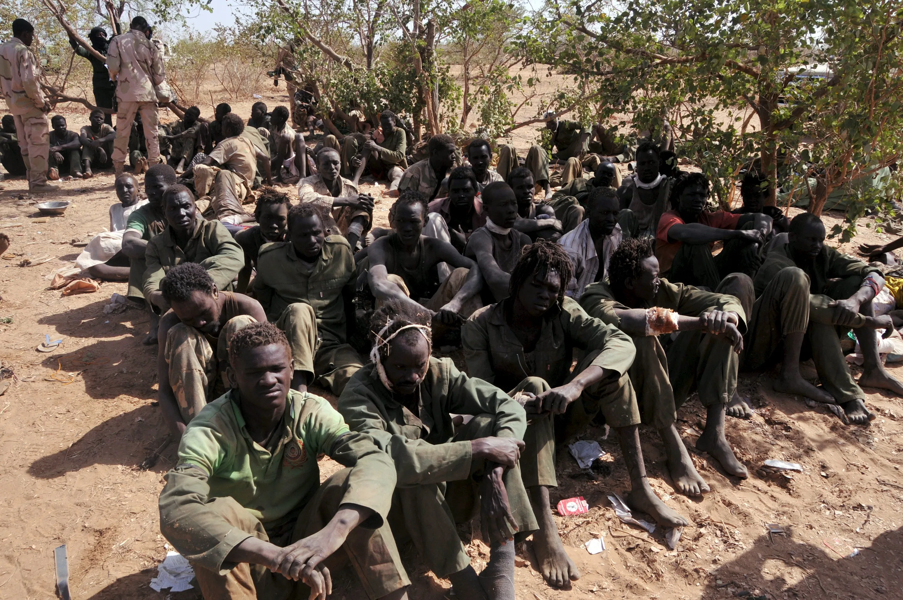 Justice and Equality Movement (JEM) rebels, who were captured after being defeated by the Sudanese Armed Forces (SAF) and the Rapid Support Forces (RSF), sit during a visit by Sudanese President Omar Hassan al-Bashir to the battle area of Gouz Dango in South Darfur April 28, 2015. (Photo by Reuters/Stringer)