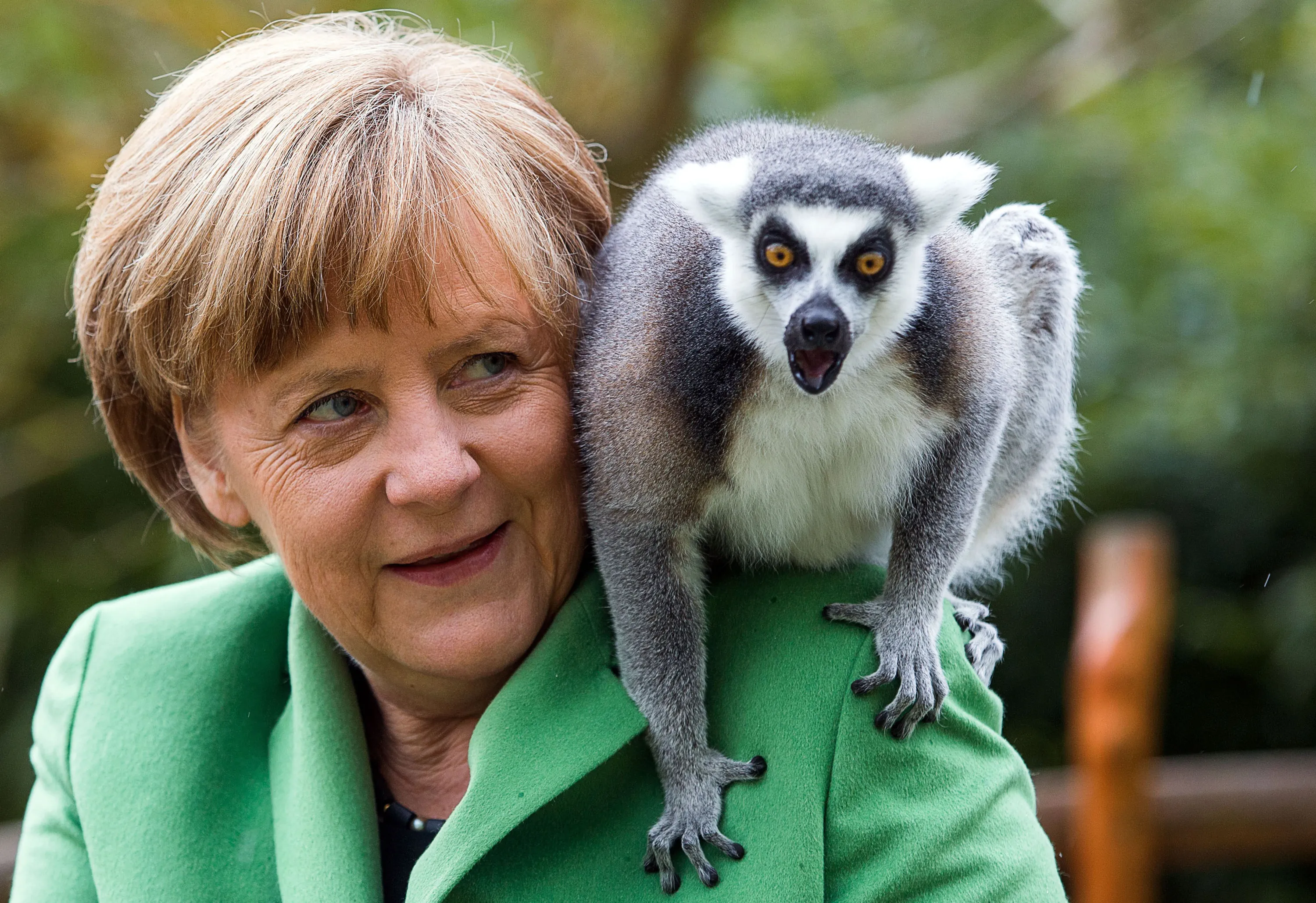 German Chancellor Angela Merkel feeds a lemur during a visit to Vogelpark Marlow (Bird Park Marlow) in Marlow, Germany, April 30, 2015. Merkel officially opened the 1.600 sqm penguin facility that will house 32 penguins, nine brown pelican and 40 Inca tern. (Photo by Jens Buettner/EPA)