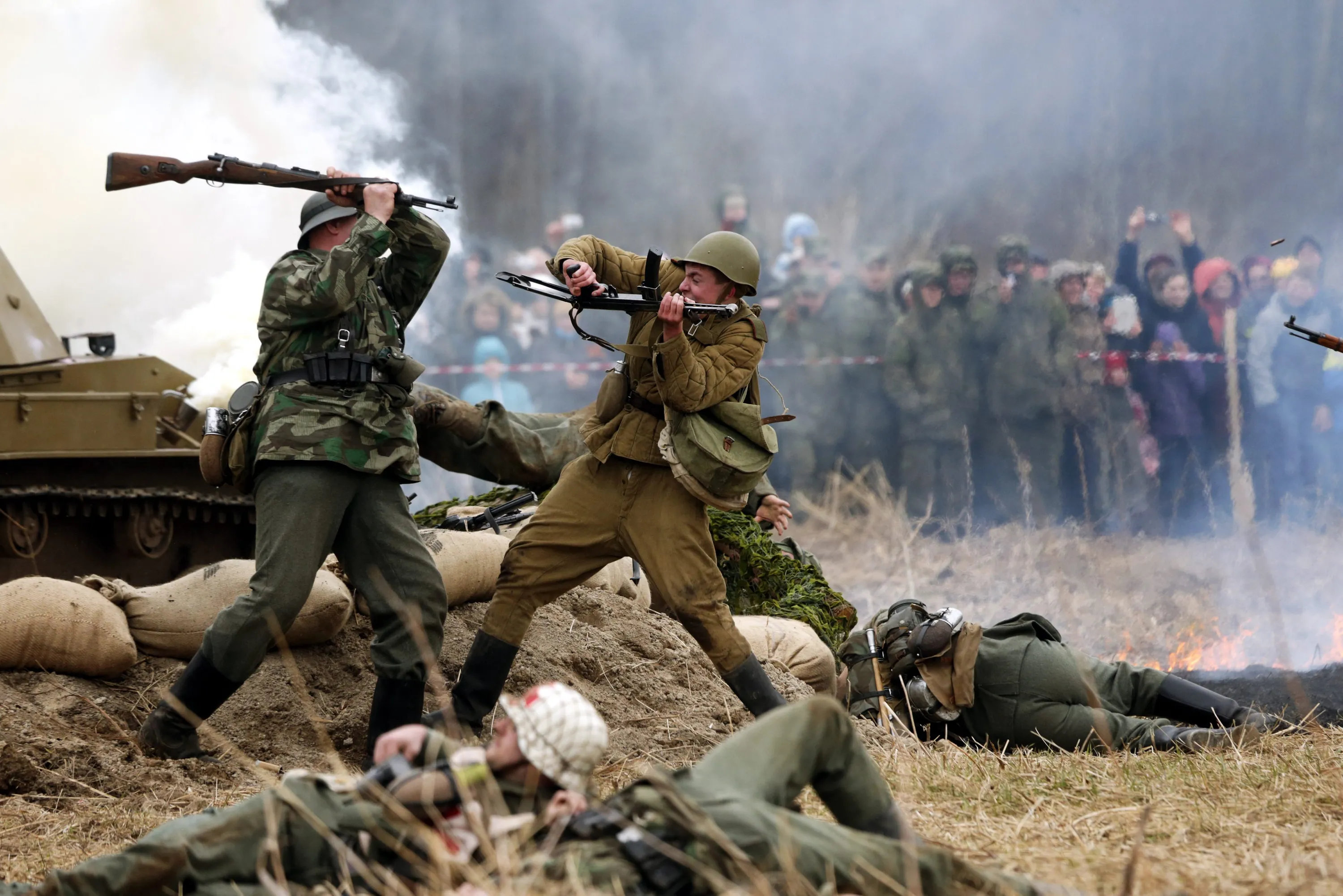 Members of a historical society re-enact one of the last battles of World War Two, in St. Petersburg, Russia, 26 April 2015. Participants donned Soviet and Nazi uniforms during a reconstruction of a battle in April 1945, marking the 70th anniversary of the Russian victory over Nazi Germany. (Photo by Anatoly Maltsev/EPA)