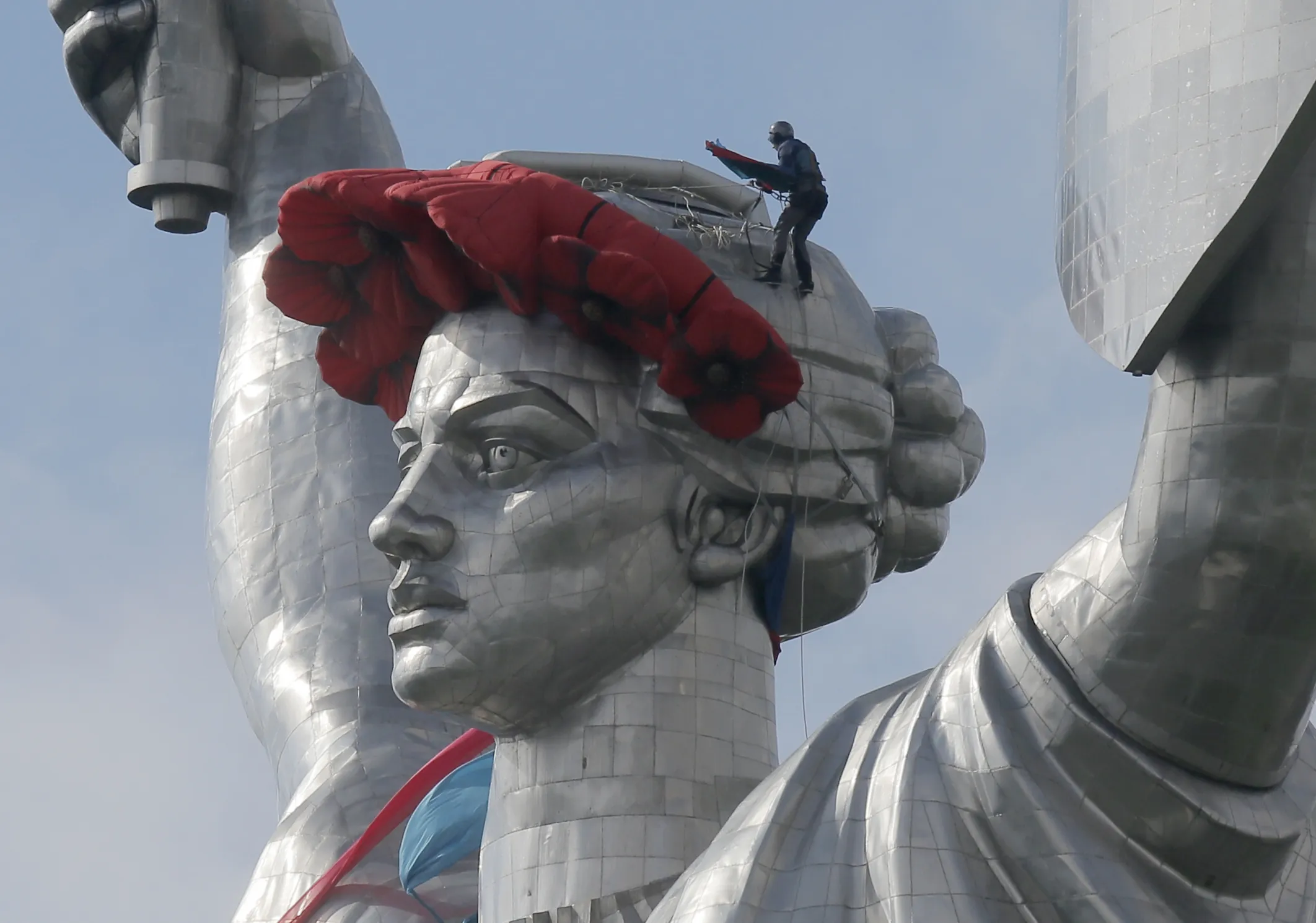 A worker installing a wreath of poppies as a red peak and ribbon on top of the 102-meter Motherland Monument in Kiev, Ukraine, on Friday, May 8, 2015, to mark the anniversary of the defeat of the Nazis in WWII. Ukraine is for the first time this year marking two holidays for the WWII victory anniversary, with a day of remembrance on May 8 and Victory Day on May 9. (Photo by Efrem Lukatsky/AP Photo)