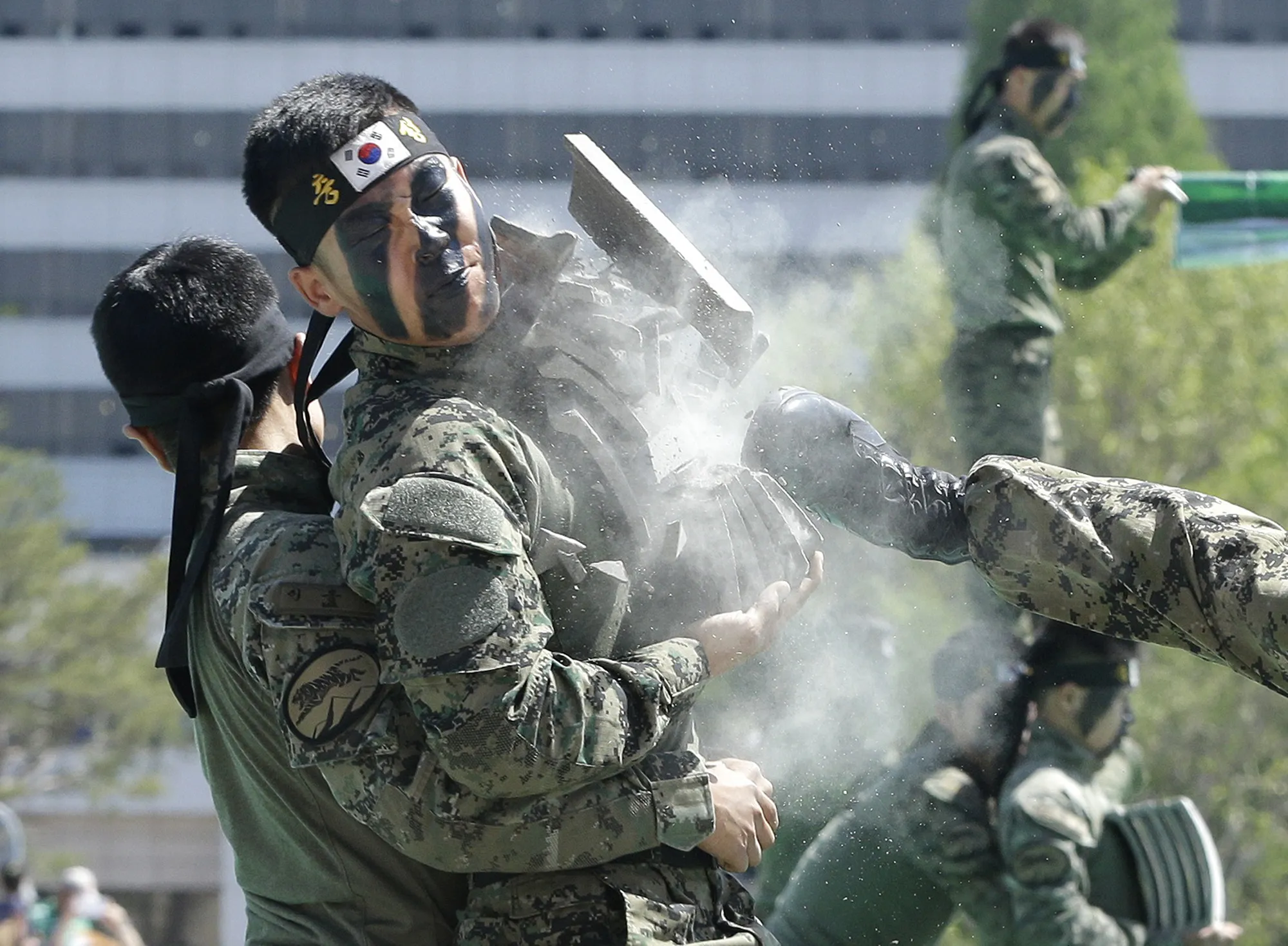 A soldier of the South Korean army special forces endures the pain as his fellow soldier breaks stone plates held by him by kicking during a martial arts demonstration for Children's Day at the War Museum in Seoul, Tuesday, May 5, 2015. May 5 is celebrated as Children's Day, a national holiday, in South Korea. (Photo by Ahn Young-joon/AP Photo)