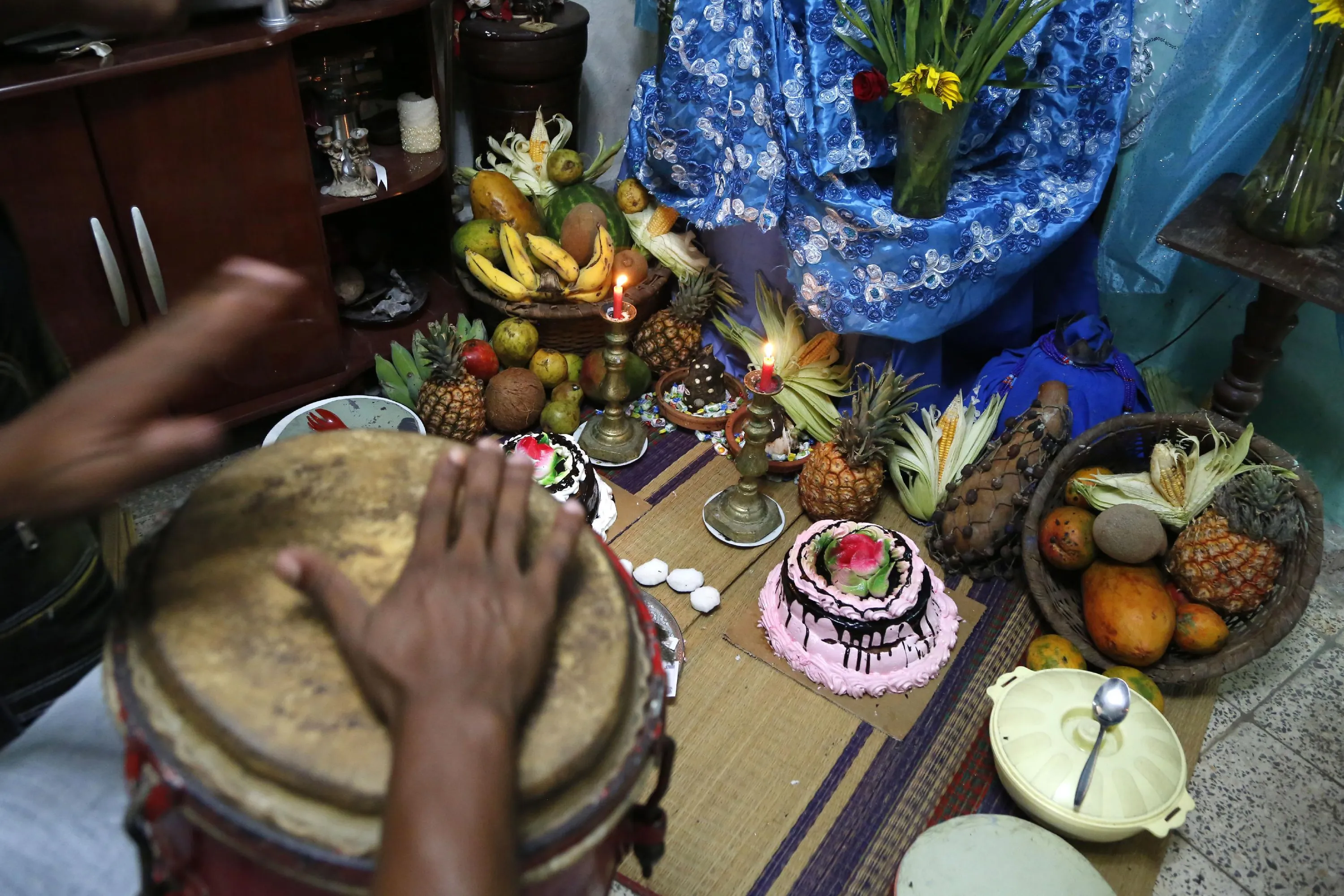 Musicians play drums in front of an altar during a santeria ceremony for the Afro-Cuban deity Yemaya in Havana, Cuba, Thursday, May 7, 2015. Afro-Cuban santeria is a fusion of African beliefs and Catholicism developed by African yoruba slaves in Cuba. (Photo by Desmond Boylan/AP Photo)