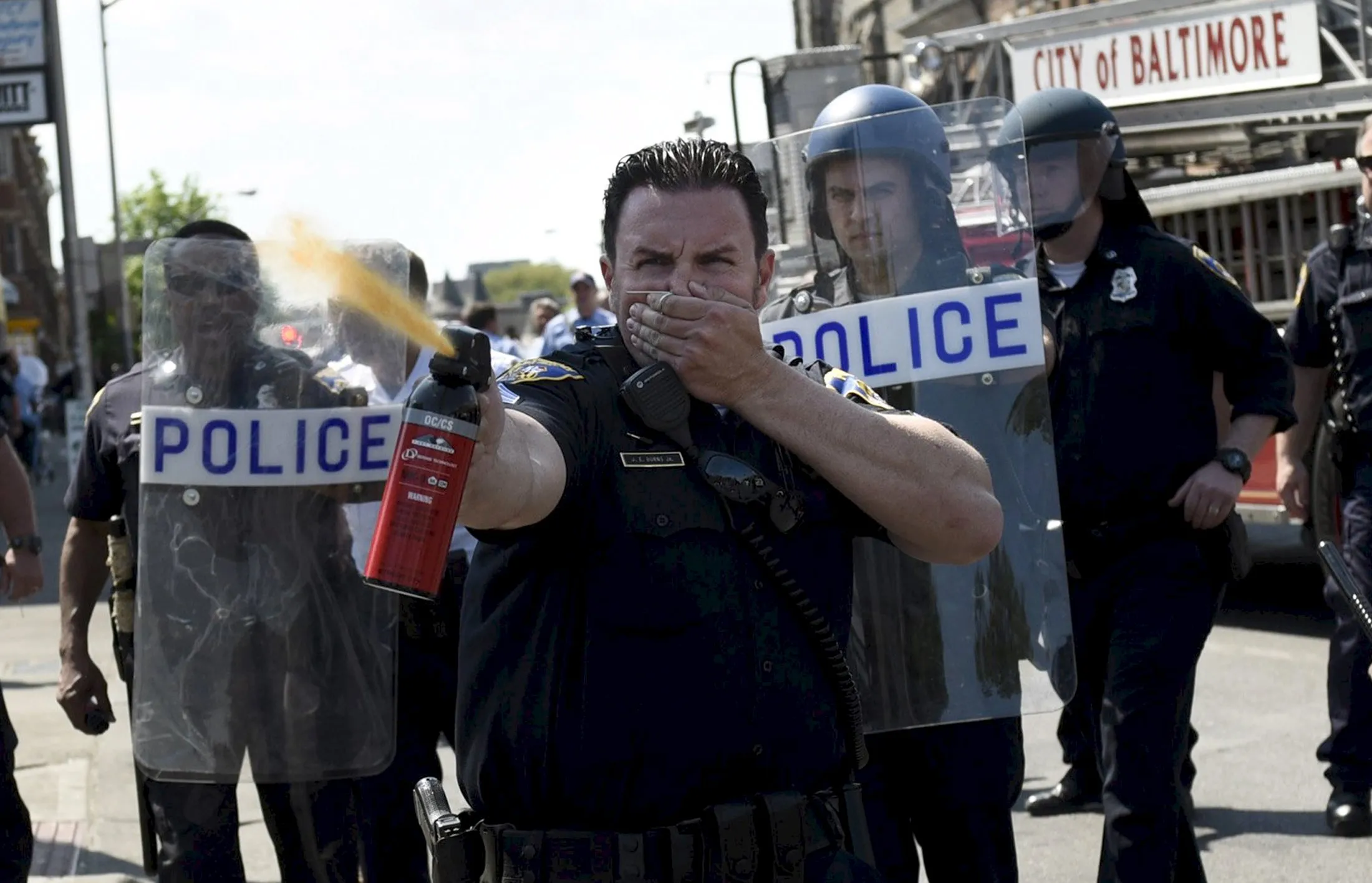 A law enforcement officer uses pepper spray to disperse the crowd at the intersection of North and Pennsylvania Avenues in Baltimore, May 4, 2015. (Photo by Sait Serkan Gurbuz/Reuters)