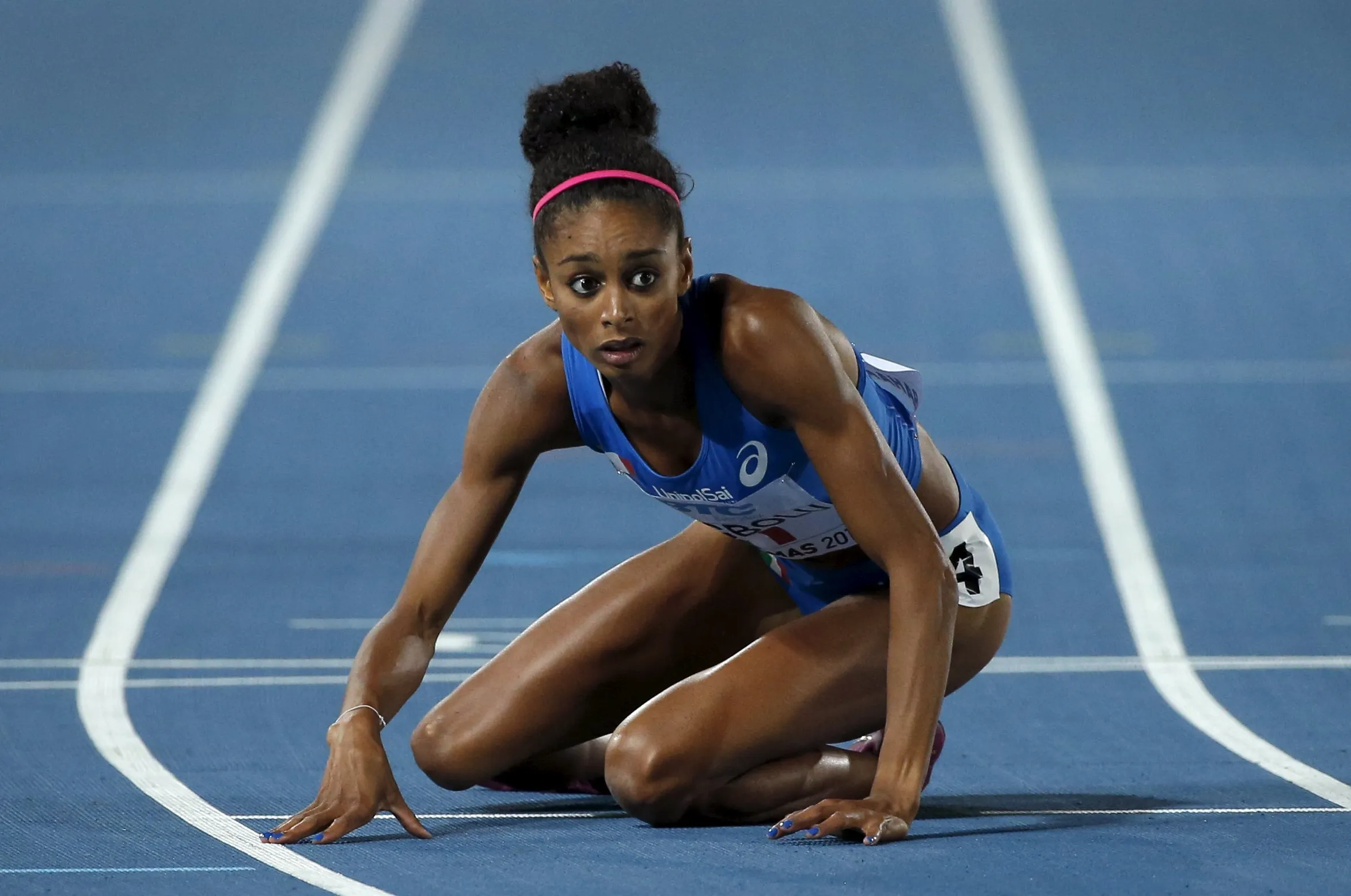 Maria Benedict Chigbolu of Italy looks uo after falling near the finish line during round one of the women's 4 x 400 meters race at the IAAF World Relays Championships in Nassau Bahamas, May 2, 2015. (Photo by Mike Segar/Reuters)