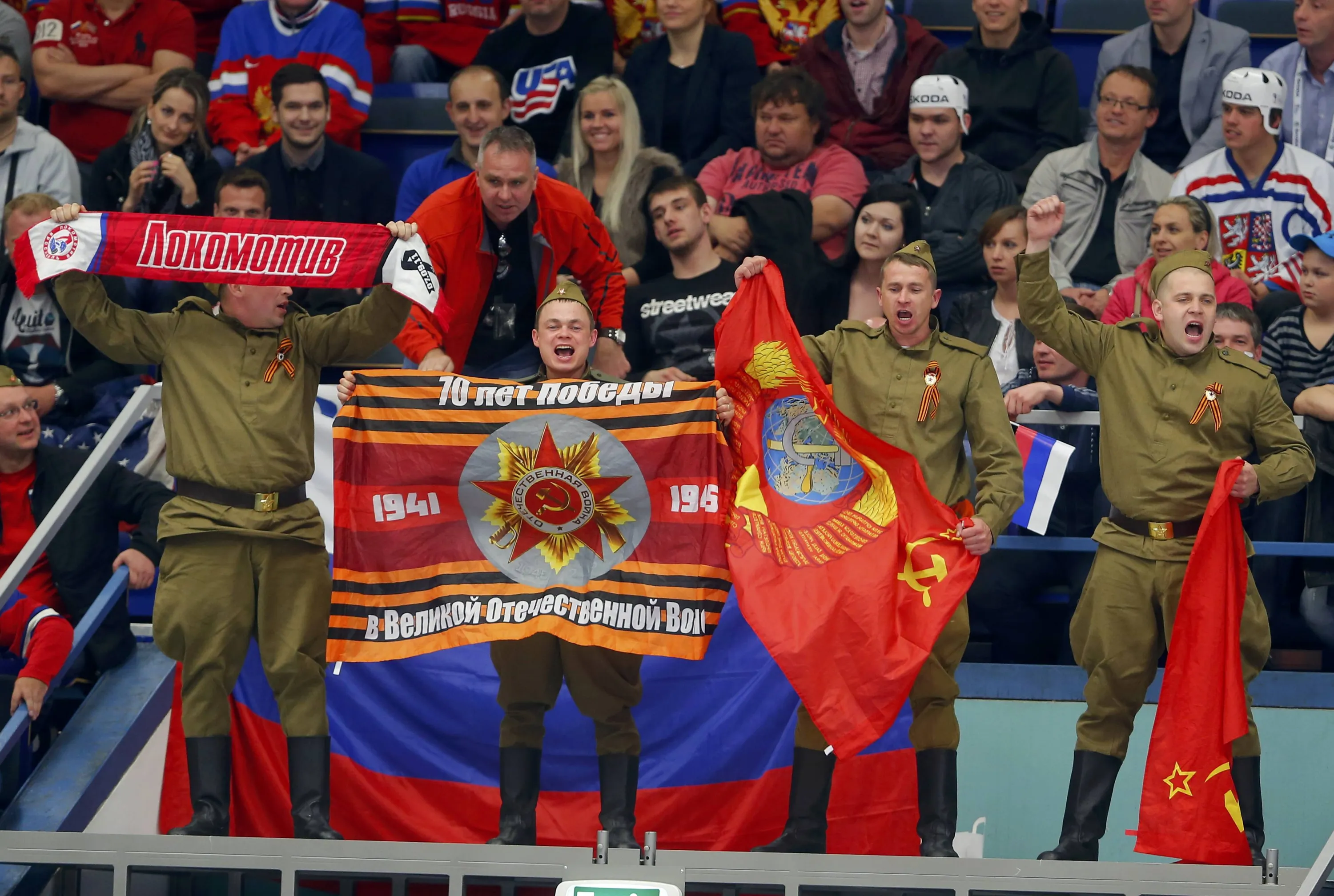 Russia's national ice hockey team supporters wave flags during their ice hockey World Championship game against the U.S. at the CEZ Arena in Ostrava, Czech Republic, May 4, 2015. (Photo by Laszlo Balogh/Reuters)