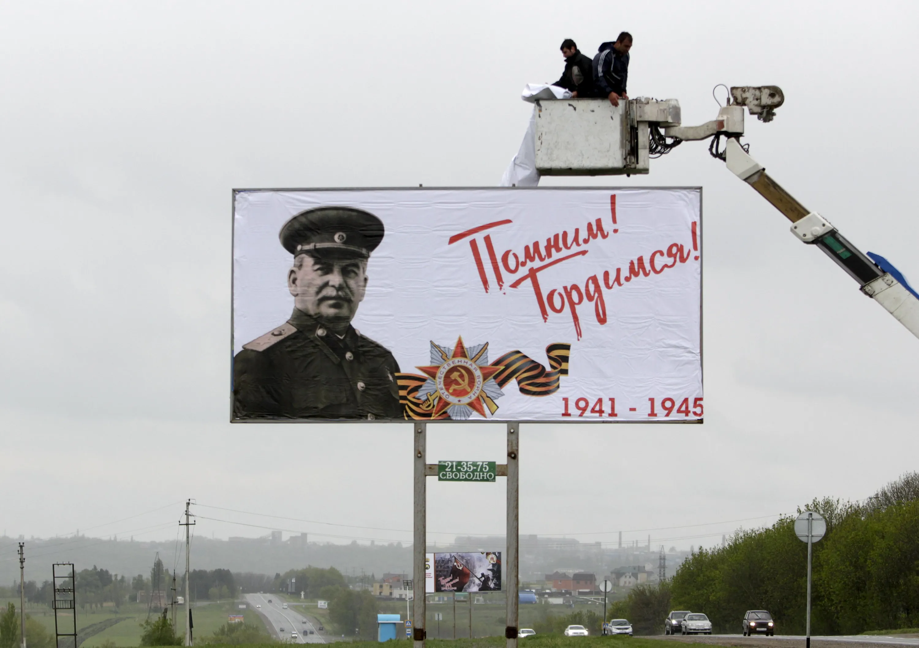 Workers fix a banner showing an image of former Soviet leader Joseph Stalin during preparations for Victory Day outside Stavropol, Russia, May 6, 2015. Russia will celebrate the 70th anniversary of the victory over Nazi Germany in World War Two on May 9. The banner reads “We remember (you)! We are proud (of you)!”. (Photo by Eduard Korniyenko/Reuters)