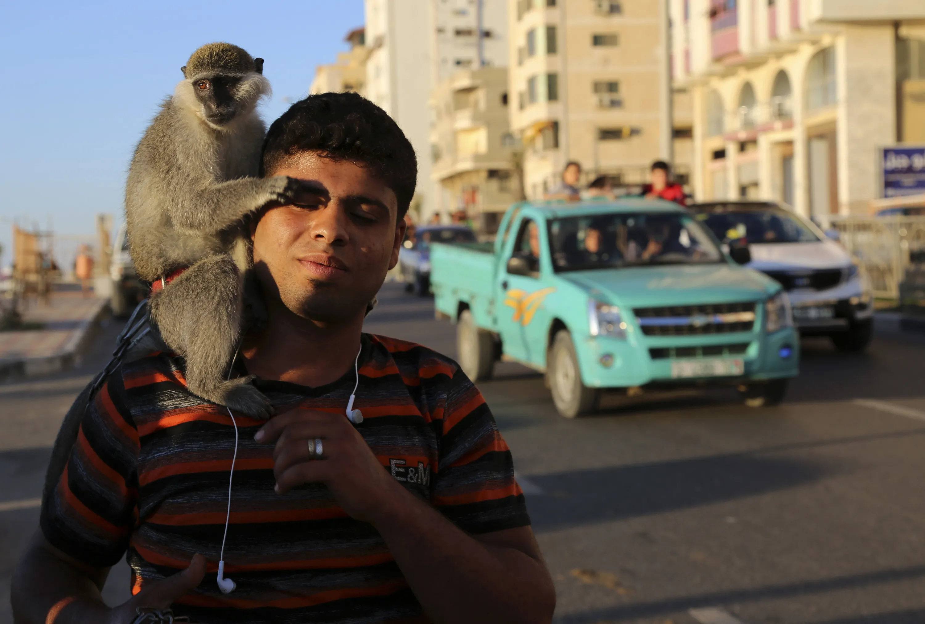 A Palestinian youth holds a monkey as he walks at the main beach road in Gaza City, northern Gaza Strip, Friday, May 8, 2015. (Photo by Adel Hana/AP Photo)