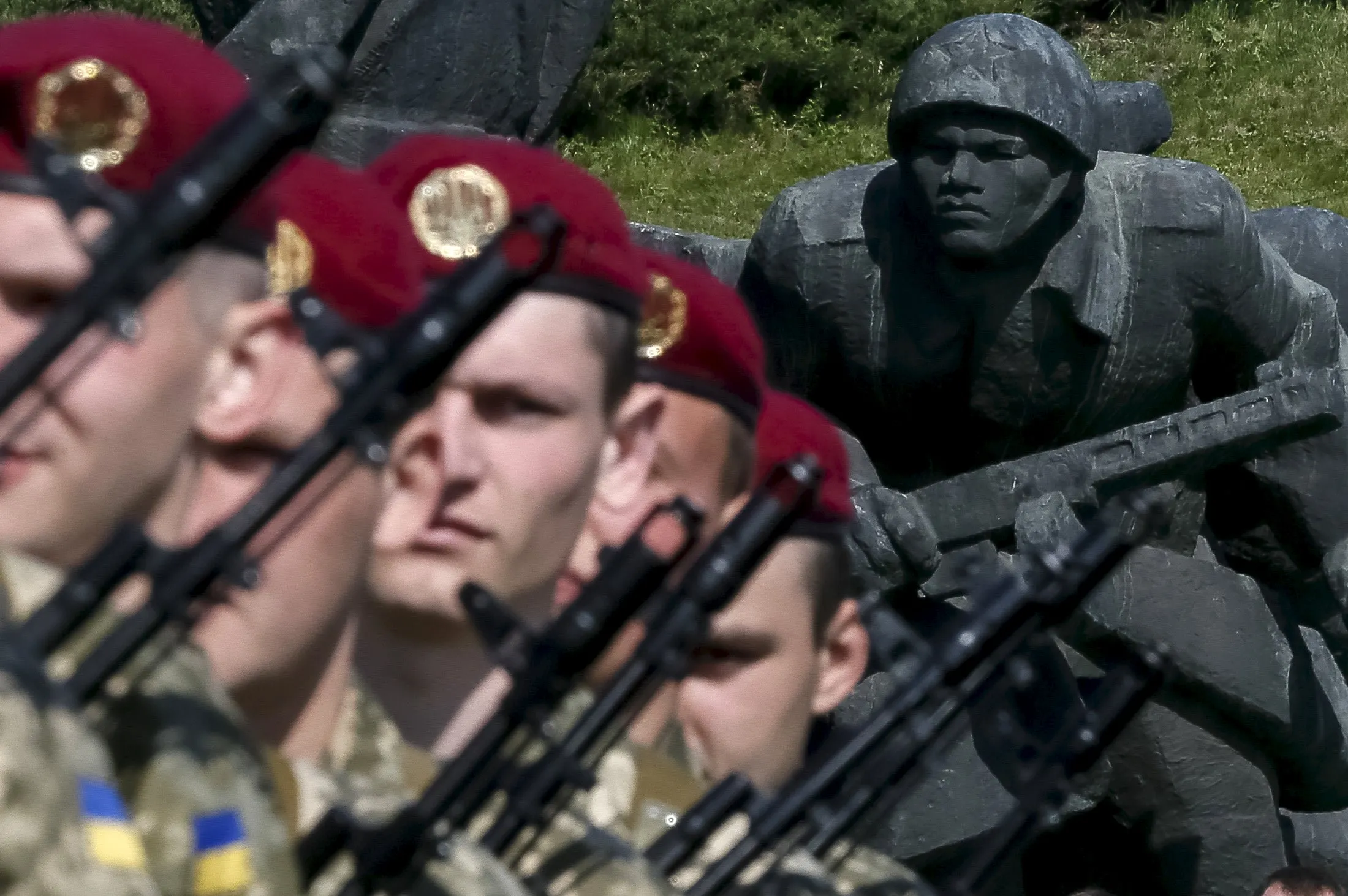 Recruits from the presidential regiment take part in Victory Day celebrations in the Museum of the Great Patriotic War in Kiev, Ukraine May 9, 2015. Spurning what is expected to be a display of military swagger in Moscow on Saturday, Kiev plans to put the accent at home on reconciliation rather than triumphalism and victory. But some Ukrainians fear associating the struggle in World War Two with today's struggle against Russia will deepen splits in a politically divided population and hand propaganda gifts to Moscow, which equates Kiev with treachery and fascism. (Photo by Gleb Garanich/Reuters)