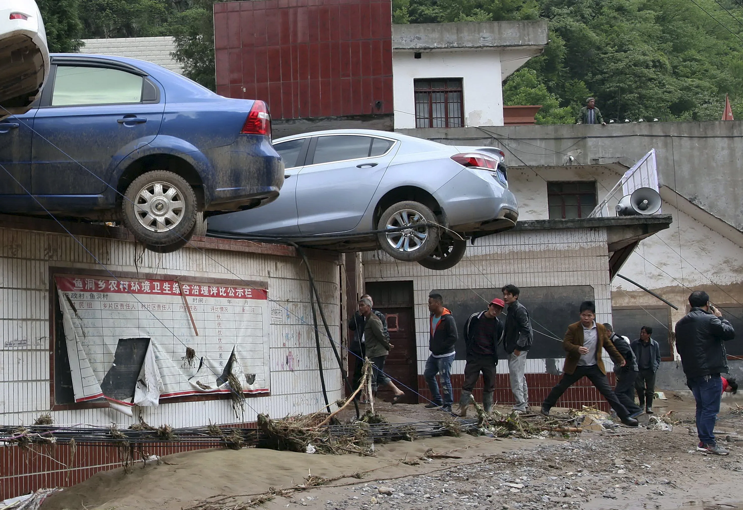 Residents walk on a muddy road next to vehicles pushed up to a wall by floodwater, after heavy rainfall hit Yudong township of Zhenxiong county, Yunnan province May 11, 2015. At least one person was killed and two remain missing after severe rainstorms hit the township on Sunday, local media reported. (Photo by Reuters/China Daily)