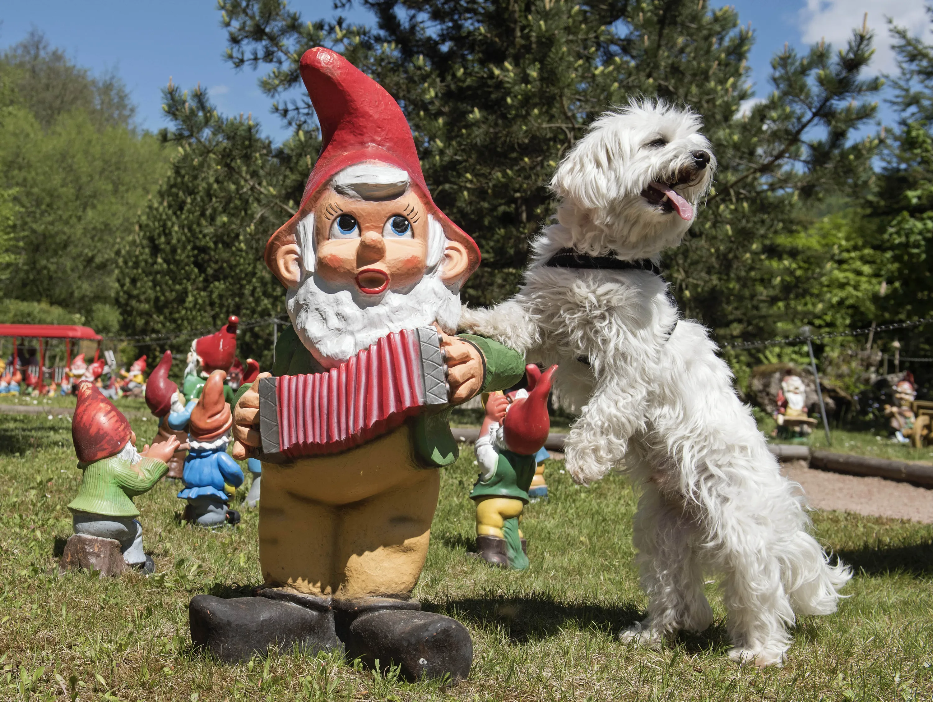 A maltese dog plays with a gnome in Germany's Garden Gnome Park (Zwergen-Park) in Trusetal, central Germany, Thursday, May 14, 2015. Every year up to 100,000 tourists visit the Garden Gnome Theme Park. The park shows more than 2,500 garden gnomes. (Photo by Jens Meyer/AP Photo)