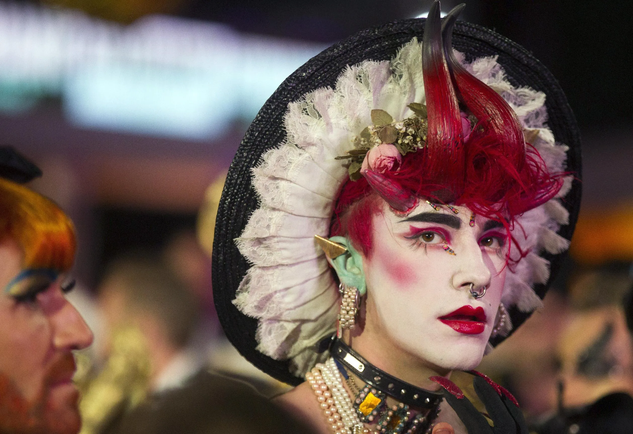 A costumed guest poses for photographers during the opening ceremony of the Life Ball in front of City Hall in Vienna, Austria, Saturday, May 16, 2015. (Photo by Herwig Prammer/AP Photo)
