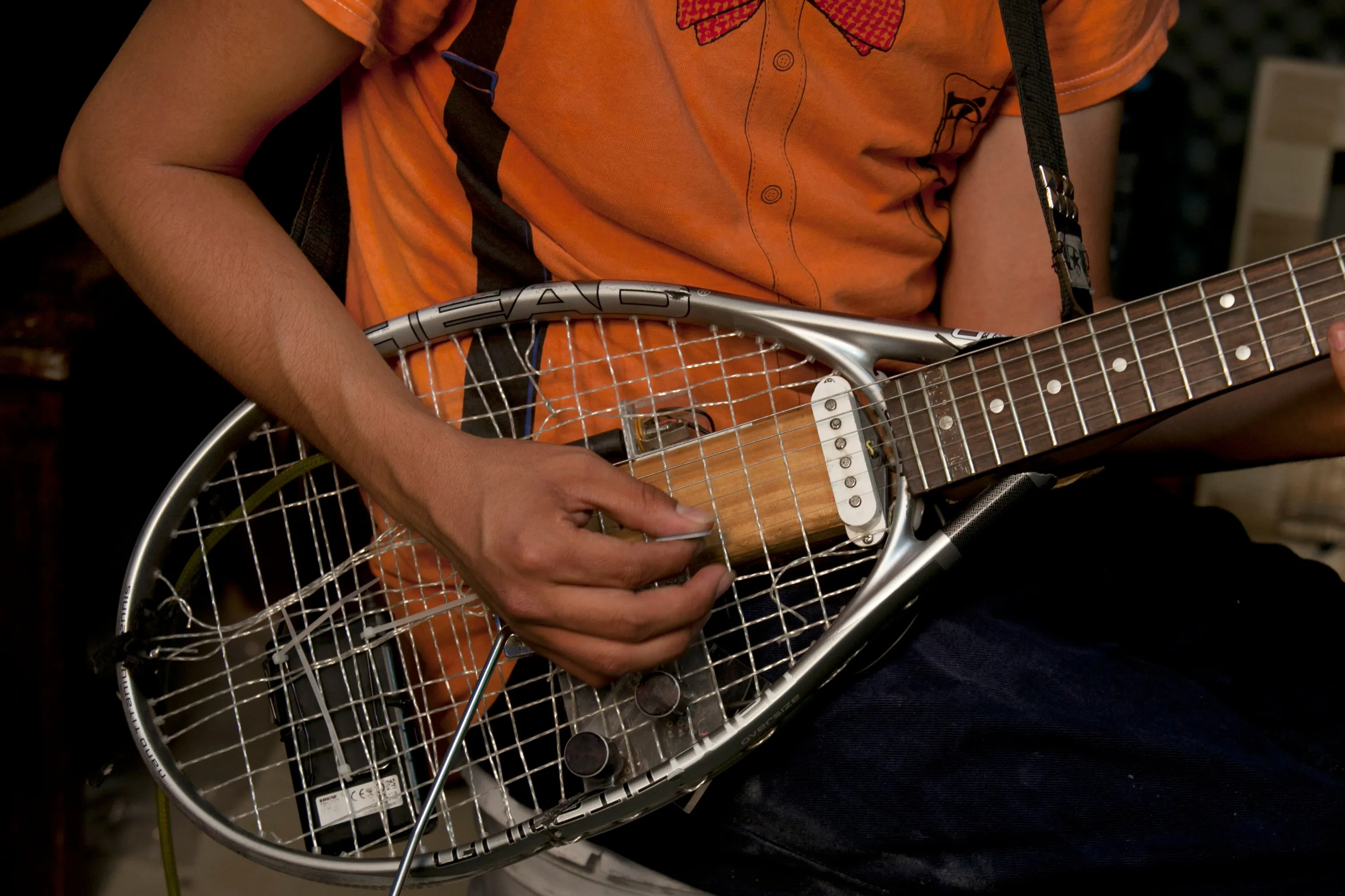 In this Friday, April 24, 2015 photo, Fernando Lopez Ramirez plays a guitar made from a discarded tennis racquet, during a jam session in the outskirts of Mexico City. Lopez Ramirez and his brothers, cousins and friends are members of the “Orquesta Basura” or Trash Ochestra. They collect trash items like pots, pans, wooden boxes, hub caps and tennis racquets from the trash in their neighboorhood and turn them into musical instruments. (Photo by Marco Ugarte/AP Photo)