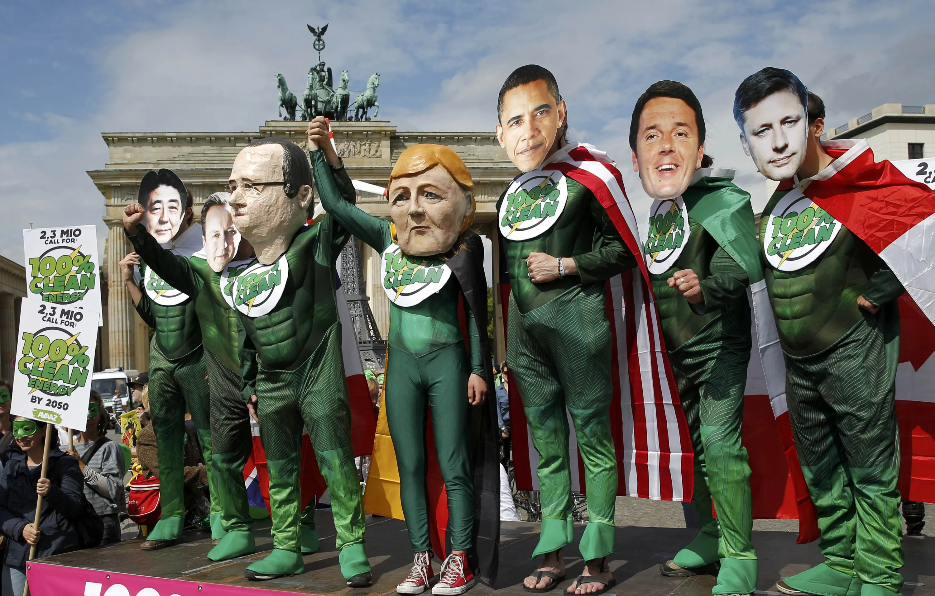 AVAAZ environmental activists wear masks depicting leaders of the countries members of the G7, (L-R) Japanese Prime Minister Shinzo Abe, British Prime Minister David Cameron, French President Francois Hollande, German Chancellor Angela Merkel, U.S. President Barack Obama, Italian Prime Minister Matteo Renzi and Canadian Prime Minister Stephen Harpe during a rally in front of the Brandenburg Gate near the venue where the Petersberg Climate Dialogue takes place in Berlin, Germany, May 19, 2015. (Photo by Fabrizio Bensch/Reuters)