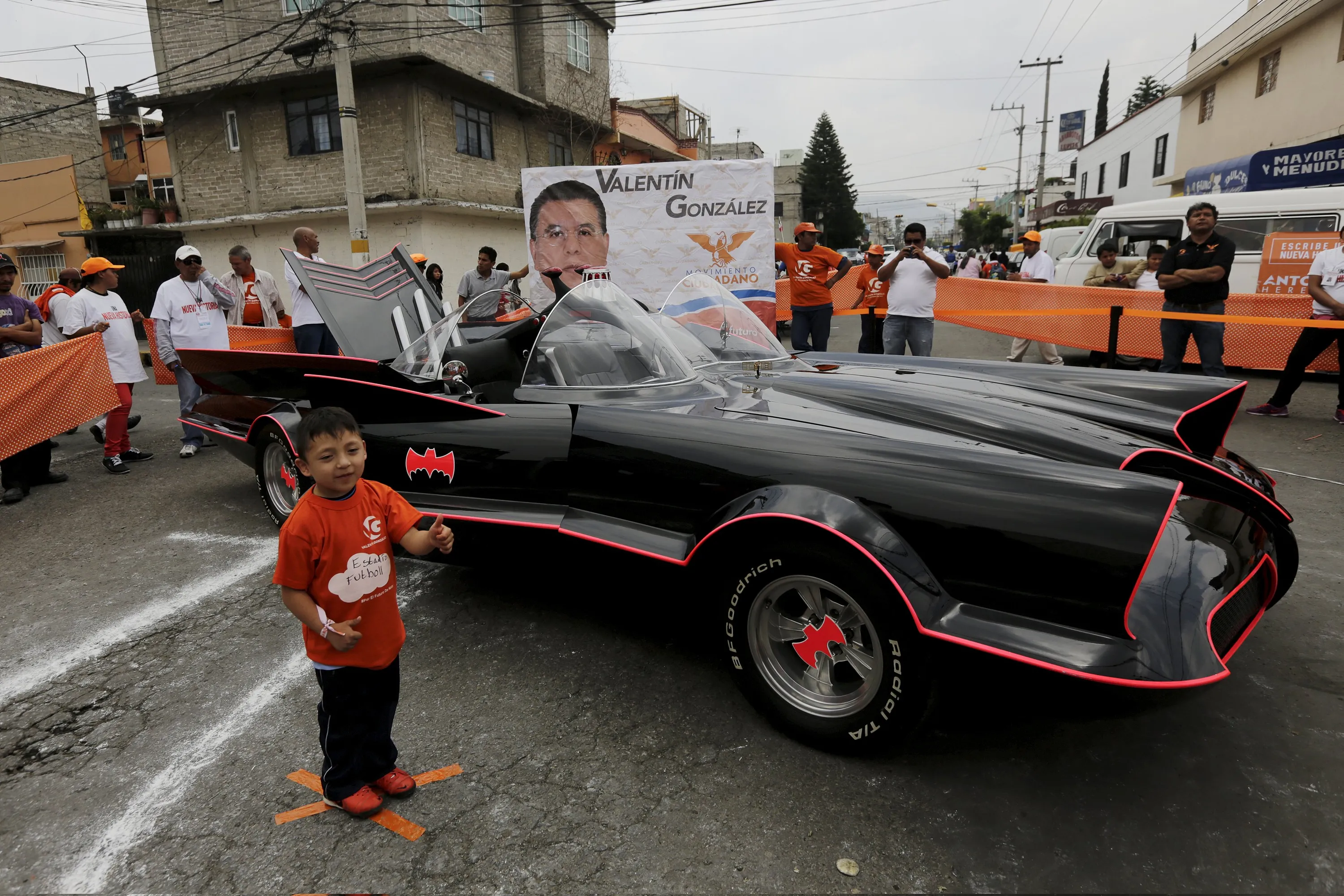 A child poses for a photograph in front of a Batmobile replica, used to promote Valentin Gonzalez, mayoral candidate for the Citizen's Movement Party (Movimiento Ciudadano), in Nezahualcoyotl, on the outskirts of Mexico City, May 22, 2015. Gonzalez vows to fight crime and insecurity by campaigning with a Batmobile replica, in an area where 1 million people live, a growing market for narcotics and illegal goods, local media reported. (Photo by Henry Romero/Reuters)