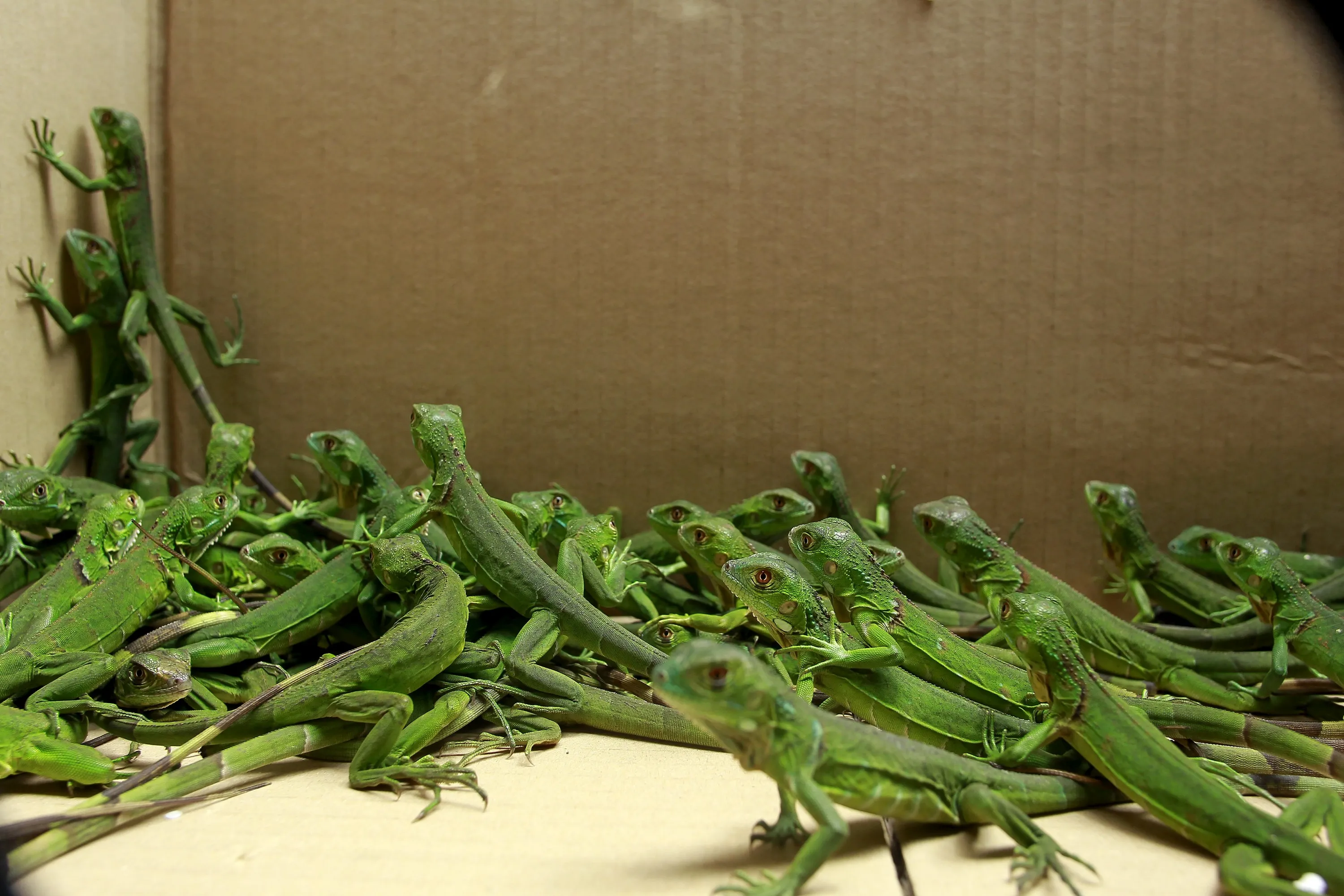 Rescued baby iguanas are pictured in a cardboard box, in an office of the Ministry of Environment in San Jose, May 25, 2015. Officers from the national police force of Costa Rica rescued 81 iguanas that had been confined to a box at a hotel in San Jose. It is presumed that the captive iguanas were the subject of an exotic pet smuggling, according to a press release issued by the Ministry of Public Security. The Ministry of the Environment rehabilitated the iguanas to a natural habitat today. (Photo by Juan Carlos Ulate/Reuters)