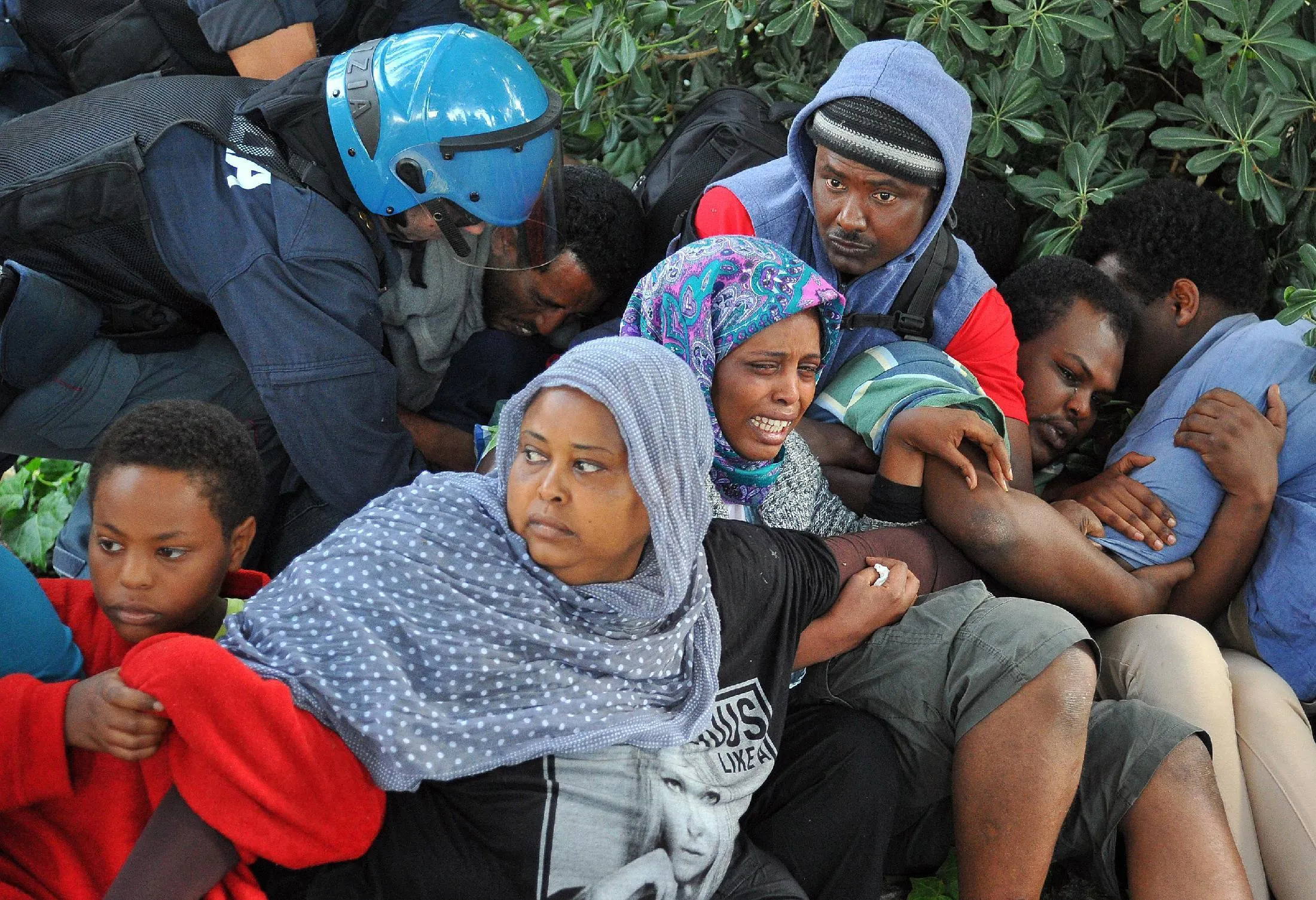 Italian Police remove migrants in Ventimiglia, at the Italian-French border Tuesday, June 16, 2015. Police at Italy's Mediterranean border with France have forcibly removed some of the African migrants who have been camping out for days in hopes of continuing their journeys farther north. The migrants, mostly from Sudan and Eritrea, have been camped out for five days after French border police refused to let them cross. (Luca Zennaro/ANSA via AP)