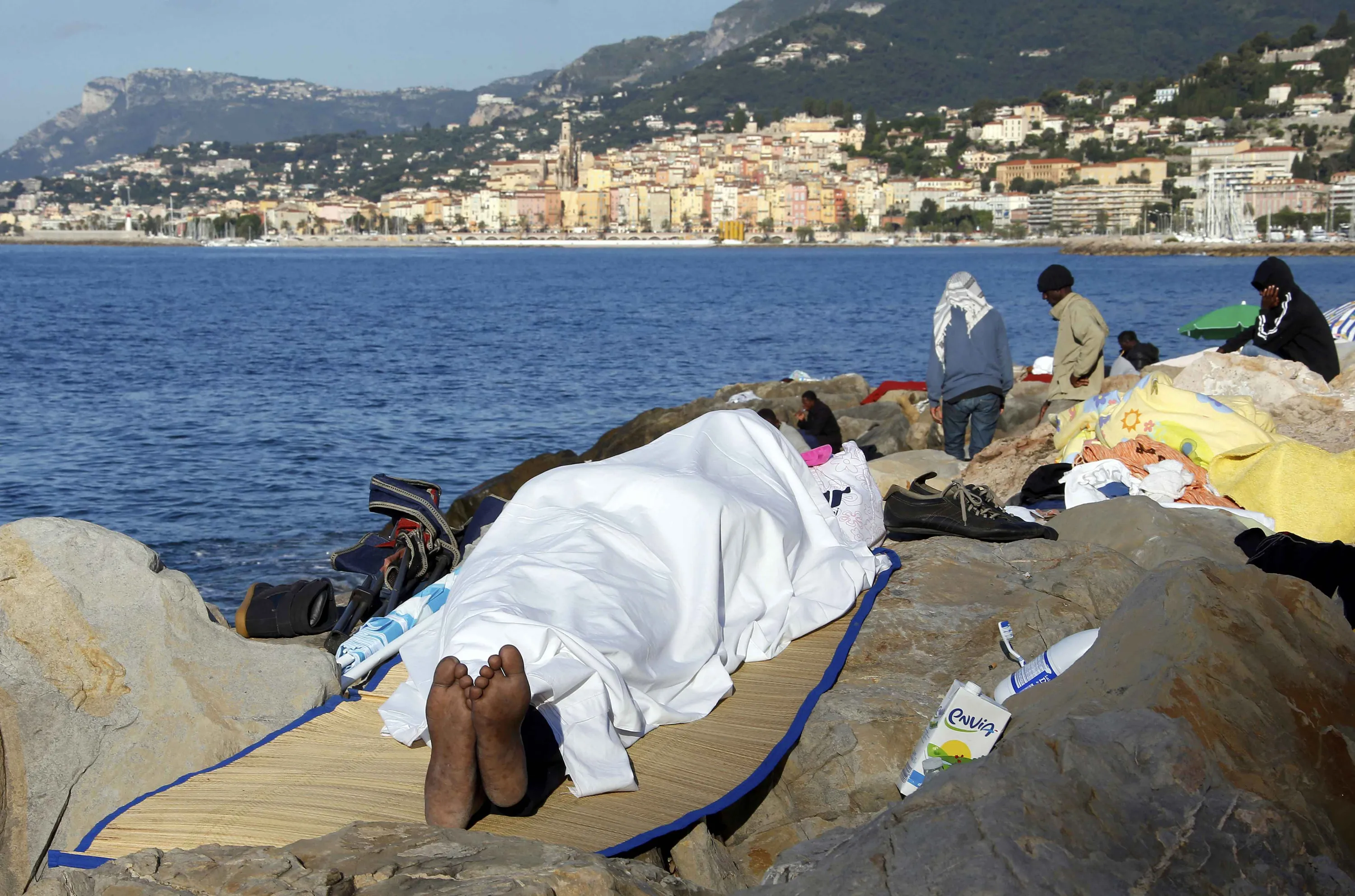 A migrant sleeps covered by a blanket on the rocks of the seawall at the Saint Ludovic border crossing on the Mediterranean Sea between Vintimille, Italy and Menton, France, June 17, 2015. Police on Tuesday began hauling away mostly African migrants from makeshift camps on the Italy-France border as European Union ministers met in Luxembourg to hash out plans to deal with the immigration crisis. The French city of Menton is seen in the background. REUTERS/Eric Gaillard