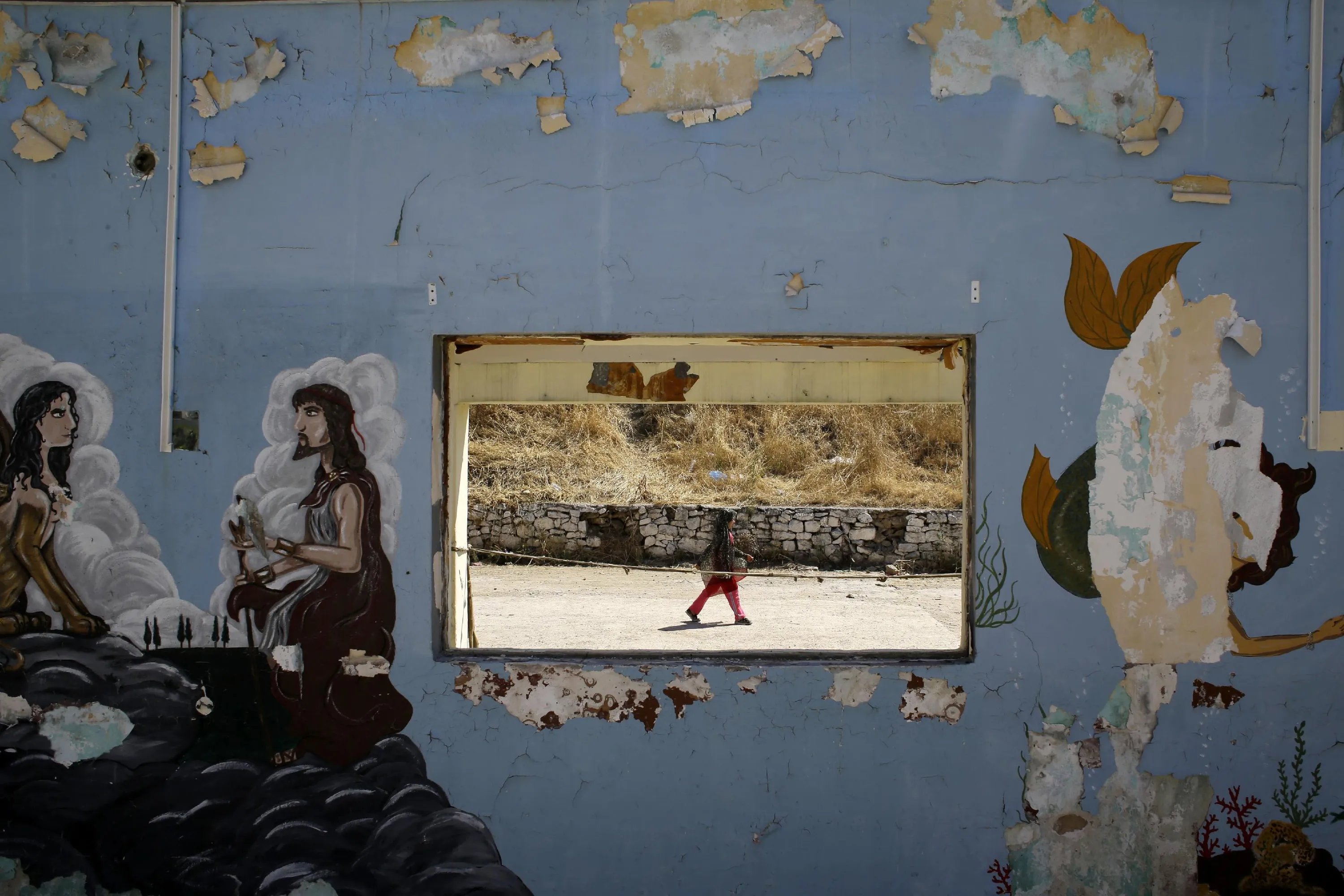 A girl walks at a refugee and migrant camp as graffiti is displayed on a wall of a former military base in the village of Moria on the northeastern Greek island of Lesvos on Wednesday, June 17, 2015. The Aegean island has borne the brunt of a huge influx of migrants from the Middle East, Asia and Africa crossing from Turkey to nearby Greek islands. More than 50,000 migrants have arrived in Greece so far this year. (AP Photo/Thanassis Stavrakis)