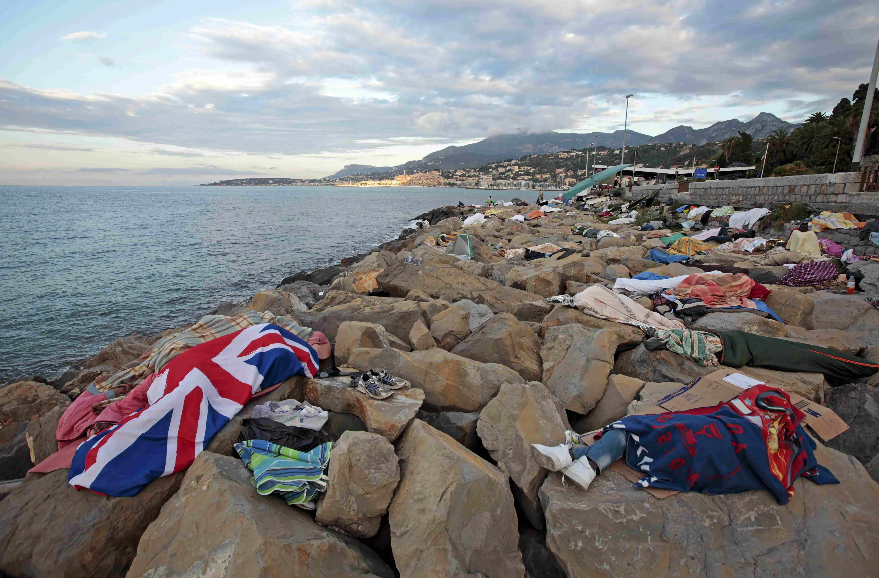 Migrant sleep on the rocks of the seawall at the Saint Ludovic border crossing on the Mediterranean Sea between Vintimille, Italy and Menton, France, June 17, 2015. On Saturday, some 200 migrants, principally from Eritrea and Sudan, attempted to cross the border from Italy and were blocked by Italian police and French gendarmes. REUTERS/Eric Gaillard