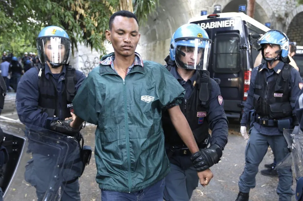 A migrant is evacuated by Italian police at the Franco-Italian border near Menton, southeastern France, Tuesday, June 16, 2015. Some 150 migrants, principally from Eritrea and Sudan, have been trying since last Friday to cross the border from Italy but have been blocked by French and Italian police. (AP Photo/Lionel Cironneau)