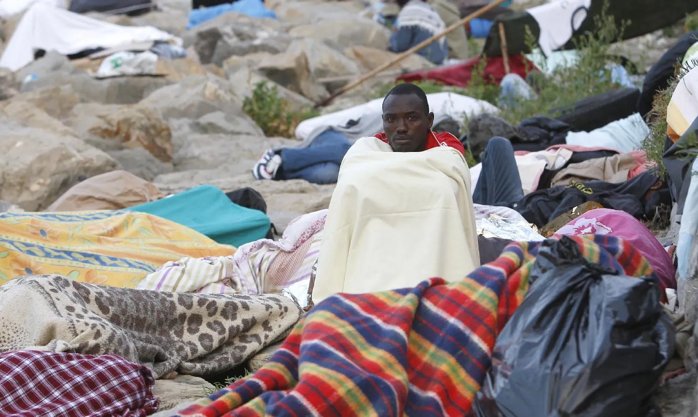 A migrant is awake while others sleep on the rocky beach at the Franco-Italian border near Menton, southeastern France Wednesday, June 17, 2015. European Union nations failed to bridge differences Tuesday over an emergency plan to share the burden of the thousands of refugees crossing the Mediterranean Sea, while on the French-Italian border, police in riot gear forcibly removed dozens of migrants. (AP Photo/Lionel Cironneau)