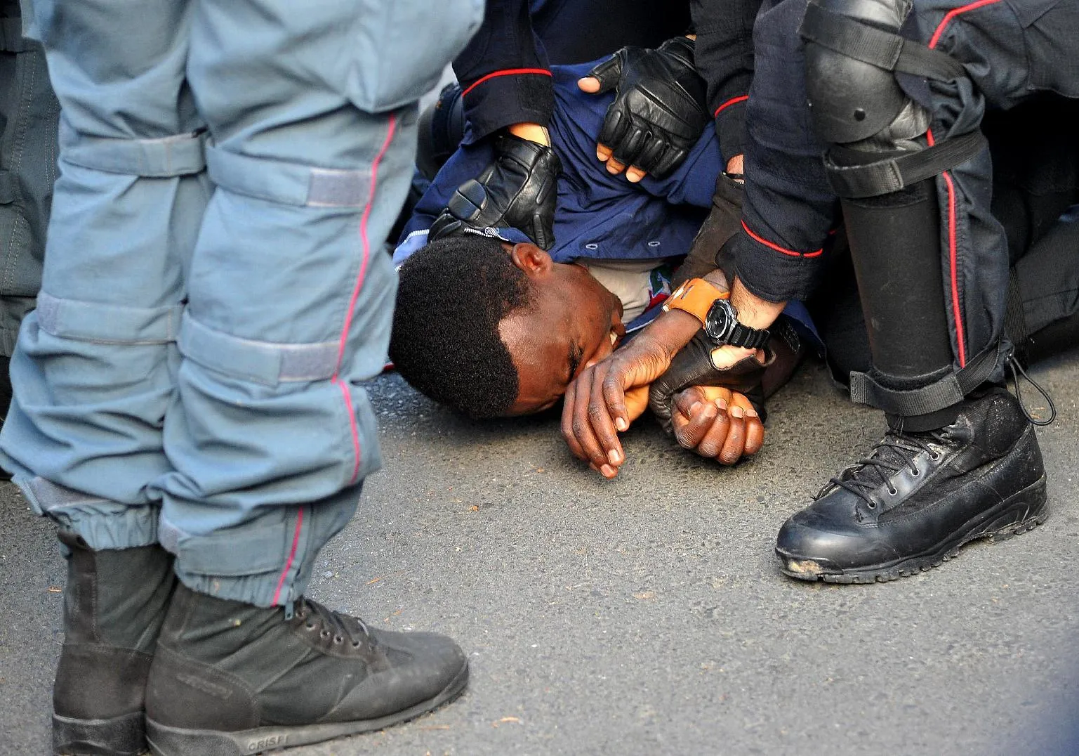 Italian police officers restrain a migrant in Ventimiglia, at the Italian-French border Tuesday, June 16, 2015. Police at Italy's Mediterranean border with France forcibly removed a few dozen African migrants who have been camping out for days in hopes of continuing their journeys farther north, a violent scene Italy is using to show that Europe needs to do something about the migrant crisis. (Luca Zennaro/ANSA via AP)