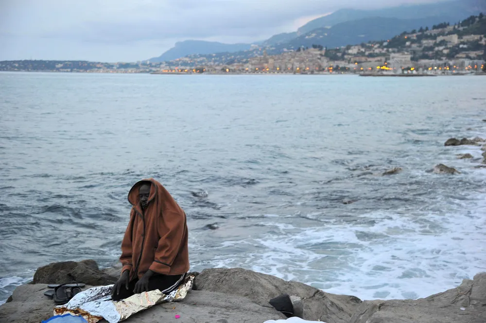 A migrant prays by the sea in Ventimiglia, at the Italian-French border, Tuesday, June 16, 2015. Police at Italy's Mediterranean border with France forcibly removed a few dozen African migrants who have been camping out for days in hopes of continuing their journeys farther north, a violent scene Italy is using to show that Europe needs to do something about the migrant crisis. (Luca Zennaro/ANSA via AP)