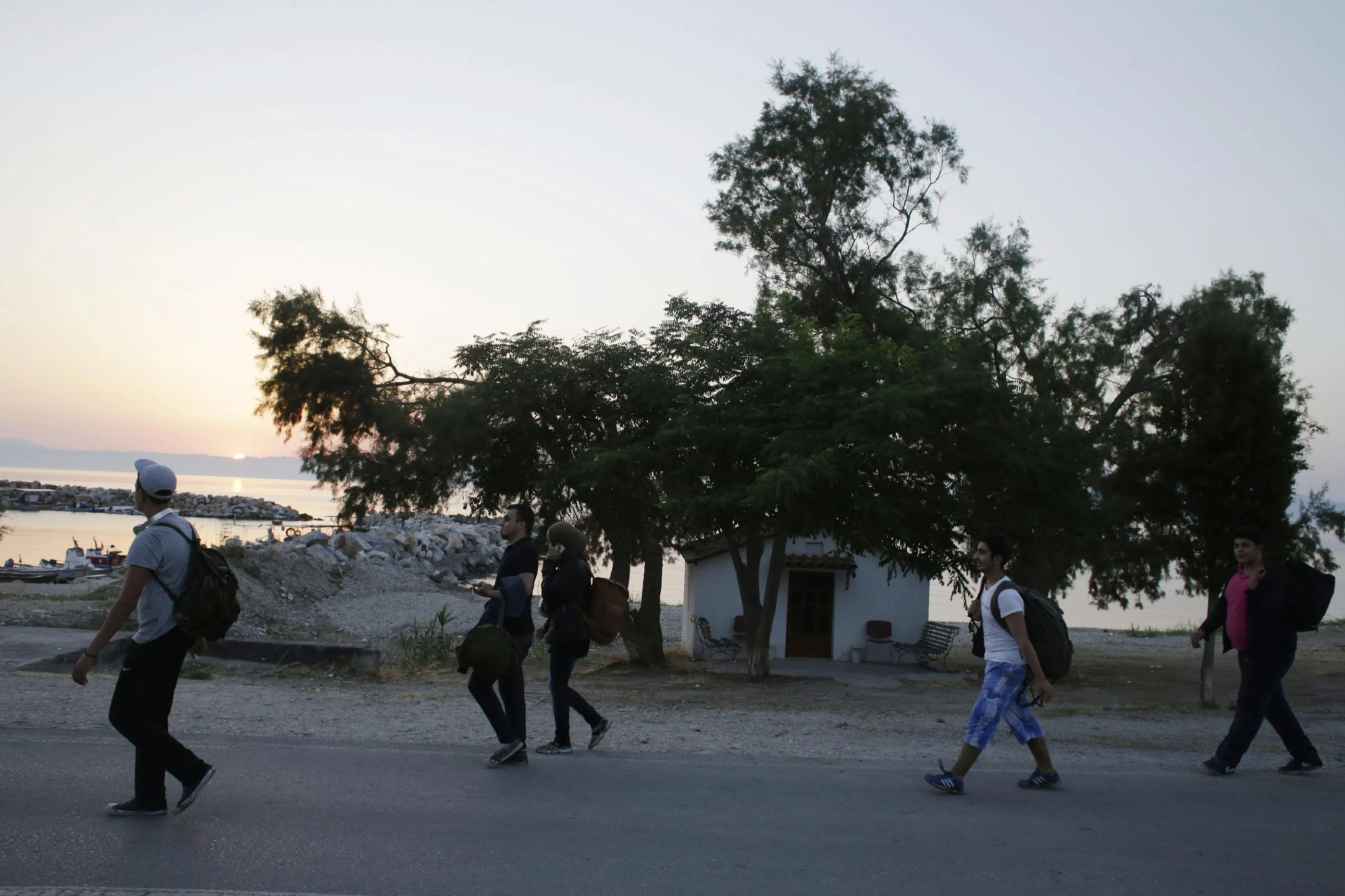 Syrian migrants walk next to a small Greek Orthodox church as the sun rises after their arrival from Turkish coasts at a beach in Mytilene, on the northeastern Greek island of Lesvos, early Tuesday, June 16, 2015. Lesvos has been bearing the brunt of a huge influx of migrants from the Middle East, Asia and Africa crossing from the Turkish coast to nearby Greek islands. More than 50,000 migrants have arrived in Greece already this year, compared to 6,500 in the first five months of last year. (AP Photo/Thanassis Stavrakis)