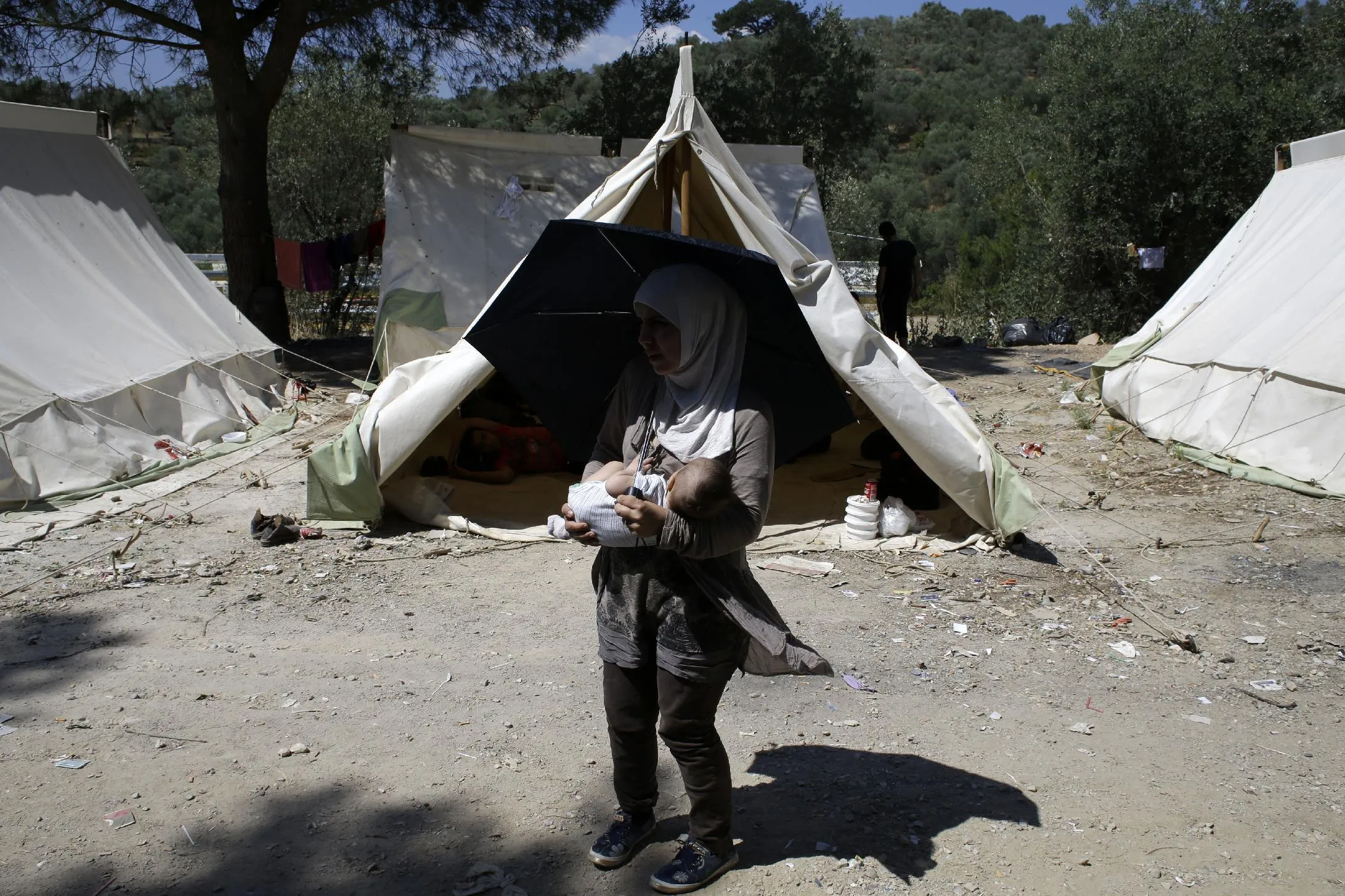 A Syrian mother holds her ten month-old son Ahmad after their arrival at a refugee and migrant camp in the village of Moria on the northeastern Greek island of Lesvos on Wednesday, June 17, 2015. The Aegean island has borne the brunt of a huge influx of migrants from the Middle East, Asia and Africa crossing from Turkey to nearby Greek islands. More than 50,000 migrants have arrived in Greece so far this year. (AP Photo/Thanassis Stavrakis)