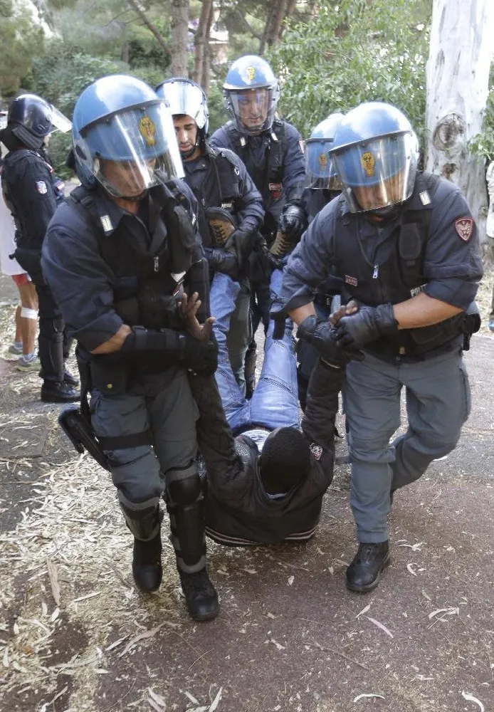 A migrant is evacuated by Italian police at the Franco-Italian border near Menton, southeastern France, Tuesday, June 16, 2015. Some 150 migrants, principally from Eritrea and Sudan, have been trying since last Friday to cross the border from Italy but have been blocked by French and Italian police. (AP Photo/Lionel Cironneau)