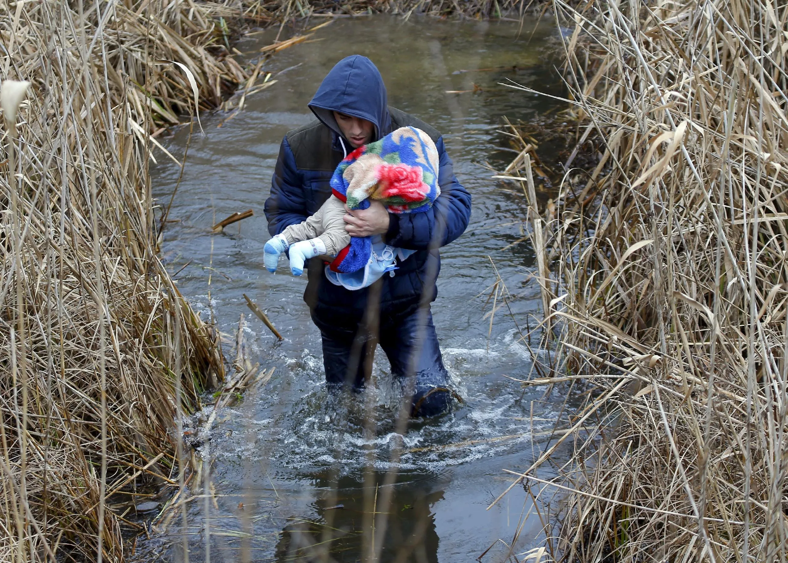 A Kosovar man wades through the water while carrying his child as they illegally cross the Hungarian-Serbian border near the village of Asotthalom, Hungary in this February 6, 2015 file photo. Hungary announced plans on Wednesday to build a four-meter-high fence along its border with Serbia to stem the flow of illegal migrants, in a move likely to annoy human rights groups and the European Union. The landlocked central European country of 10 million people is in the EU's visa-free Schengen zone and thus an attractive destination for tens of thousands of migrants entering Europe through the Balkans from the Middle East and beyond. REUTERS/Laszlo Balogh/Files