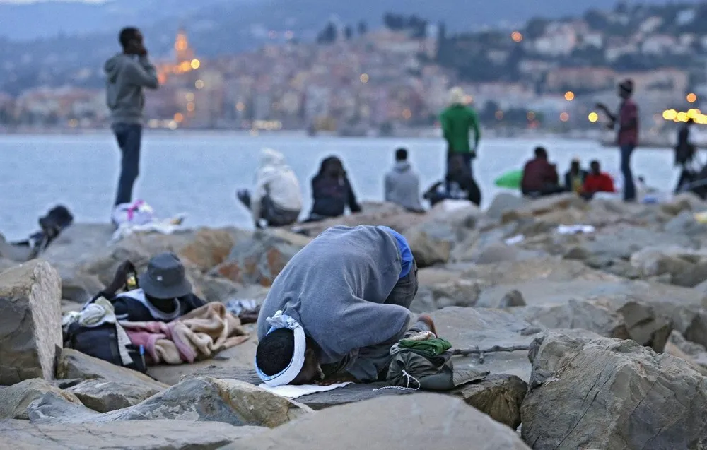 Migrant kneels in prayer, in Ventimiglia, at the Italian-French border Tuesday, June 16, 2015. Police at Italy's Mediterranean border with France forcibly removed a few dozen African migrants who have been camping out for days in hopes of continuing their journeys farther north, a violent scene Italy is using to show that Europe needs to do something about the migrant crisis. (AP Photo/Lionel Cironneau)