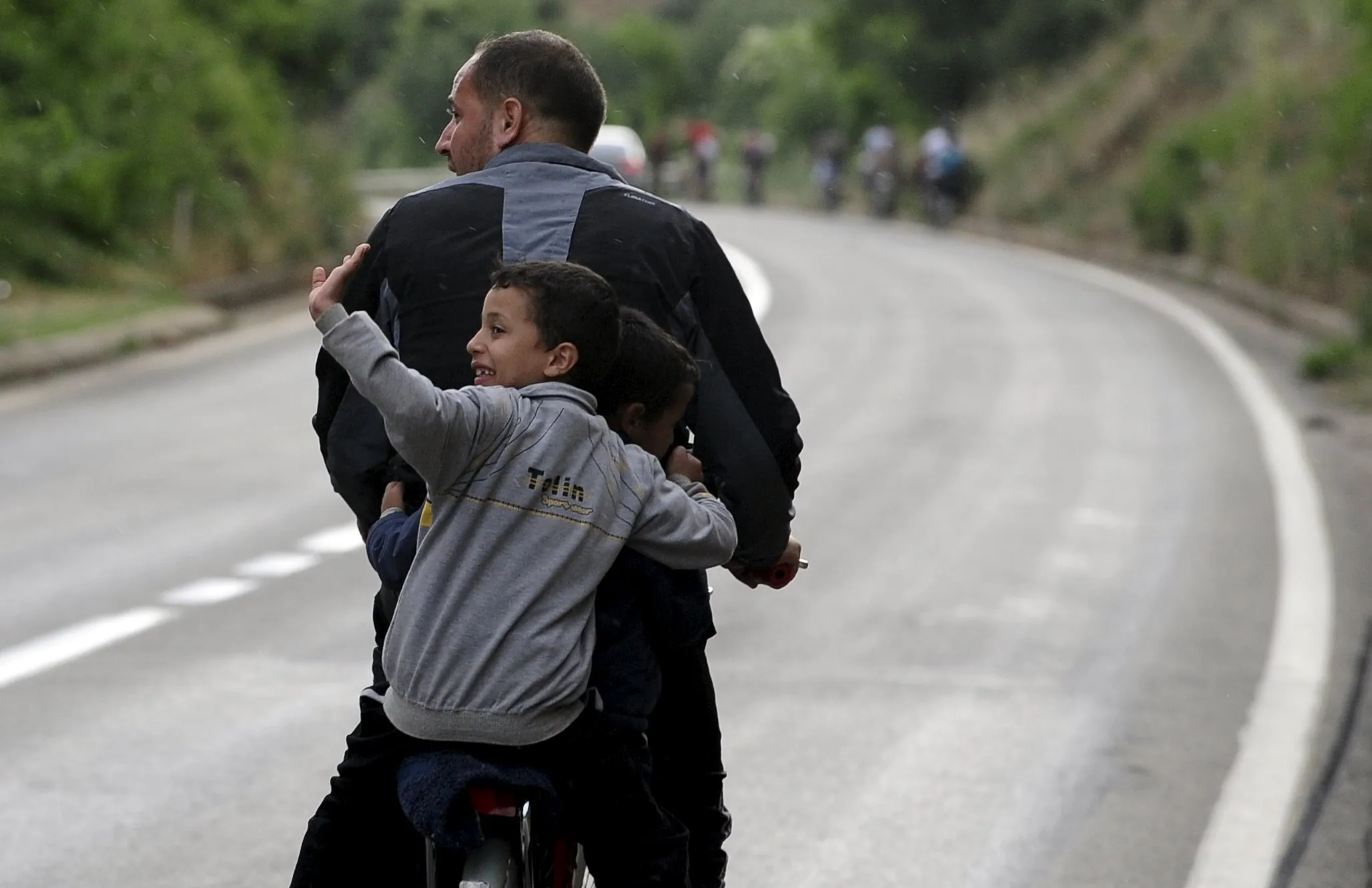 Migrants from Syria ride their bicycles near the Greek border in Macedonia June 17, 2015. Hungary announced plans on Wednesday to build a four-metre-high fence along its border with Serbia to stem the flow of illegal migrants. Tens of thousands of migrants enter Europe through the Balkans from the Middle East and Africa. REUTERS/Ognen Teofilovski