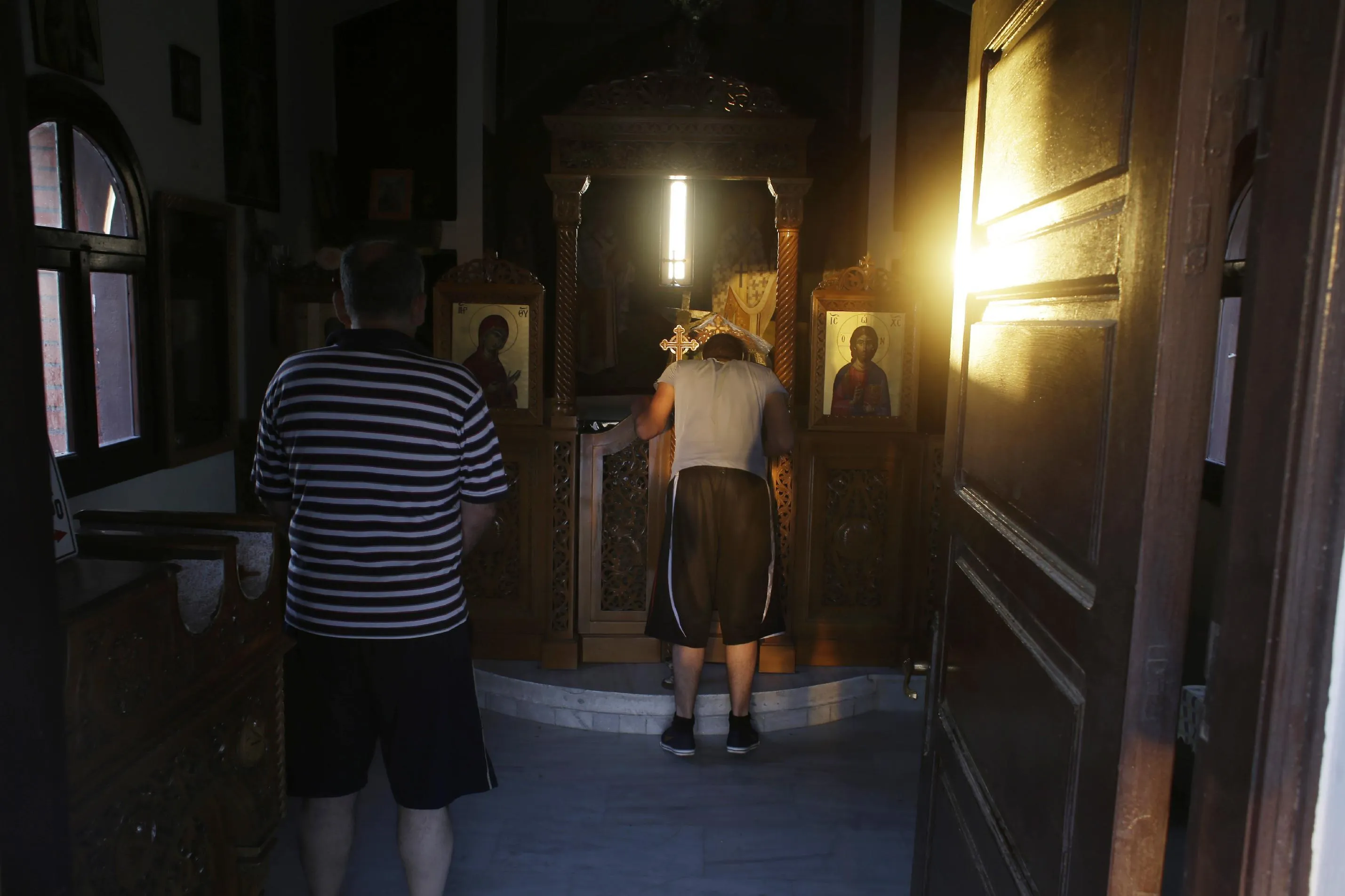 Syrian Christians John, 21, kisses an icon while his father Elias, 50, prays in a small Greek Orthodox church near the place where they arrived with dozens of other Syrians on a small boat from a Turkish coast to the Greek island of Lesvos on Wednesday, June 17, 2015. Around 100,000 migrants have entered Europe so far this year as Italy and Greece have borne the brunt of the surge with many more migrants expected to arrive from June through to September. (AP Photo/Thanassis Stavrakis)