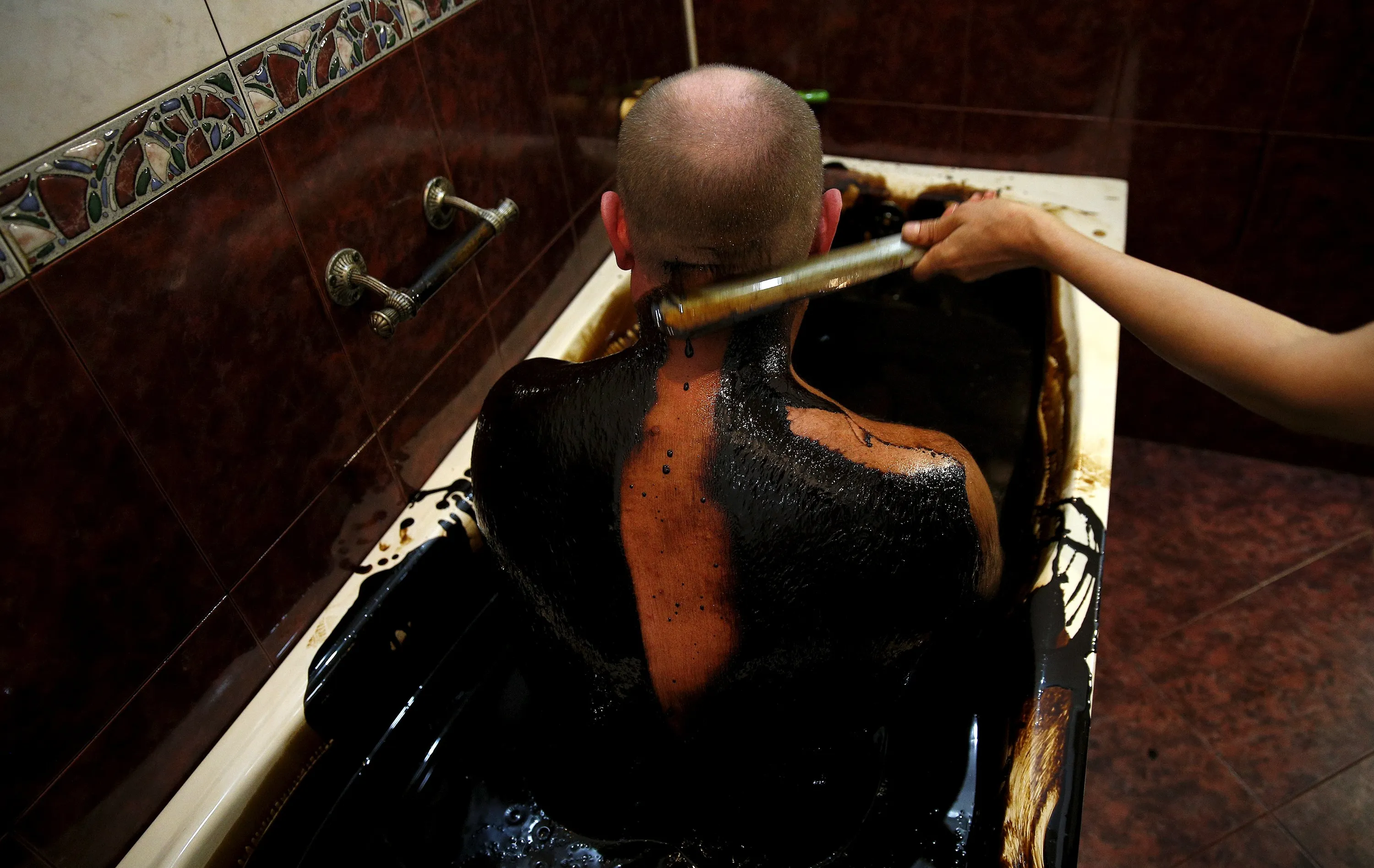 A man gets his back cleaned of crude oil as he lies in a bathtub during a health therapy session at Naftalan Health Center in Baku, Azerbaijan June 27, 2015. According to Hashim Hashimov, a medical specialist at the centre, the oil can heal more than seventy diseases, including neurological diseases, skin conditions and impotence. Centres like Naftalan attract people coming from Russia, Kazakhstan and Germany, Hashimov told Reuters. (Photo by Stoyan Nenov/Reuters)